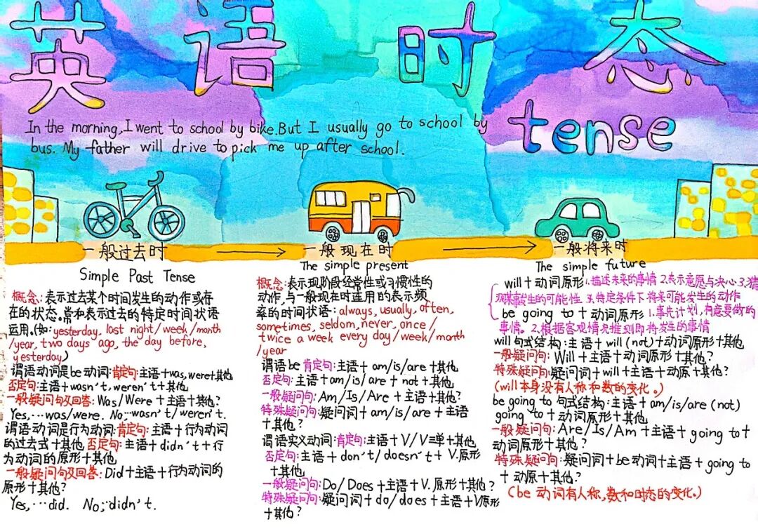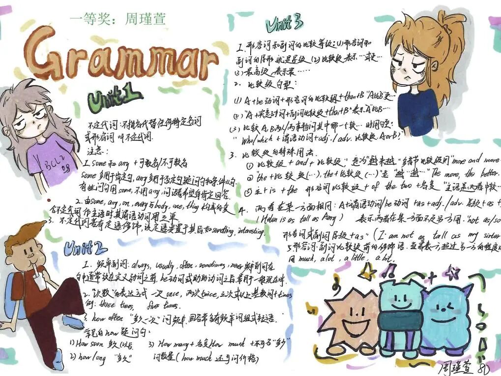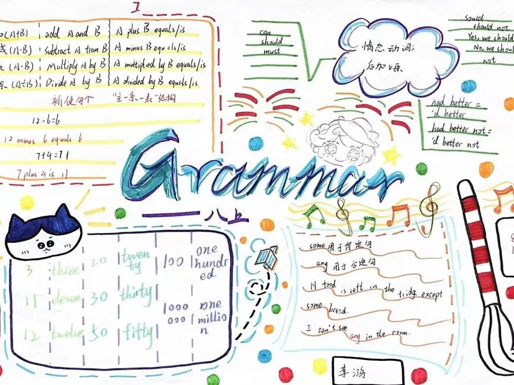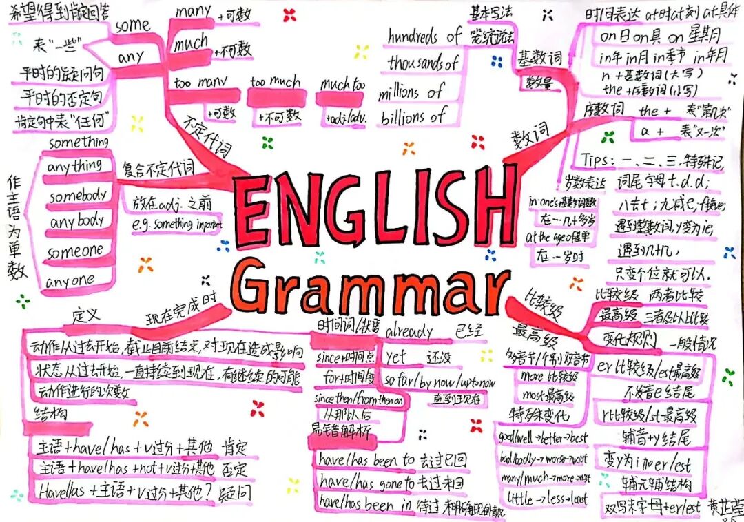 本次思维导图设计活动吸引了众多学生的积极参与,在孩子们的笔下,语法学习不再单调、枯燥,它可以如花朵绽放,也可以妙趣横生。相比于单纯的文字笔记,通过思维导图梳理语法规则,有助于孩子们增强理解和记忆,提升学习效率。