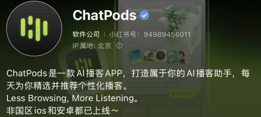 在官方小红书账号中,ChatPods 将自己定位为 AI 播客助手,而根据 Z Finance 的报道,ChatPods 的核心差异点是推荐和 AI 相关功能,对应的是“获取好内容”和“辅助吸收知识”两个核心的用户诉求|图片来源:小红书