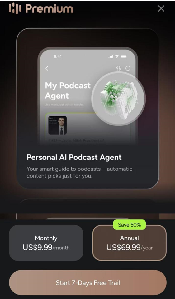 除了针对单集播客的 AI 功能,在订阅页面中还显示,用户可以获得一个“Personal AI Podcast Agent”以获得更精准、个性化的推荐内容。