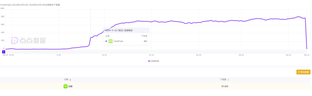 ChatPods 从上线以来的全球双端下载量,注:目前 ChatPods 已在除中国大陆外的其他市场的 iOS 及 Google Play端上架|图片来源:点点数据