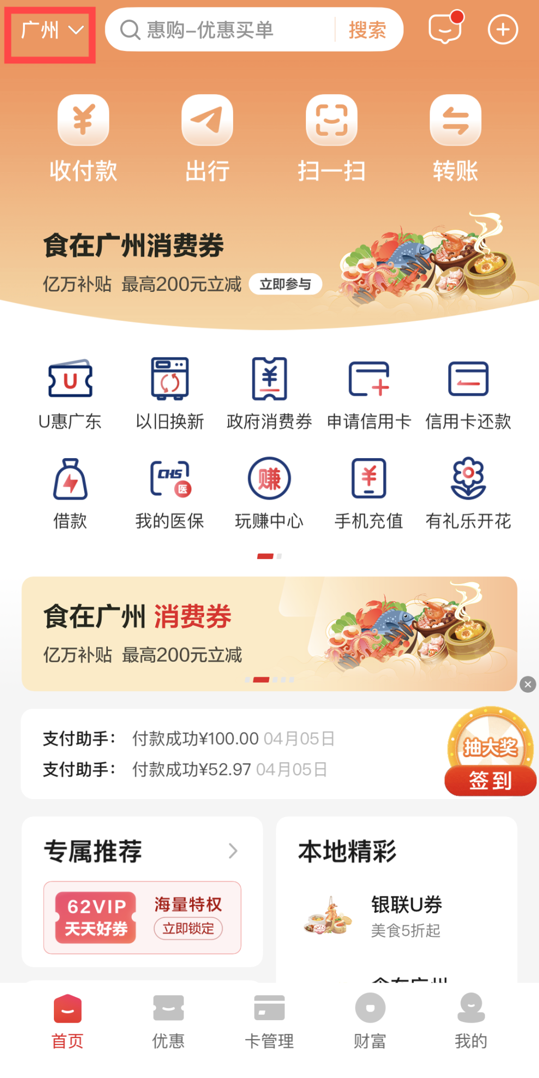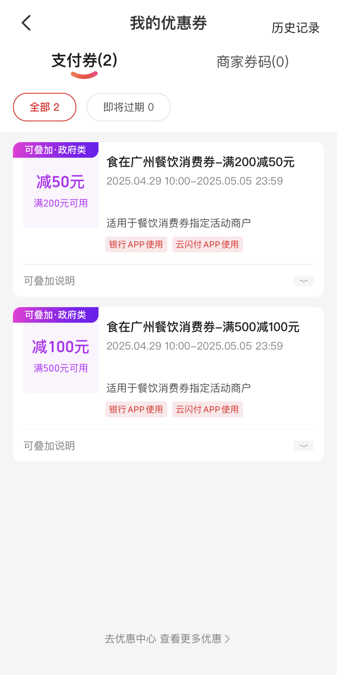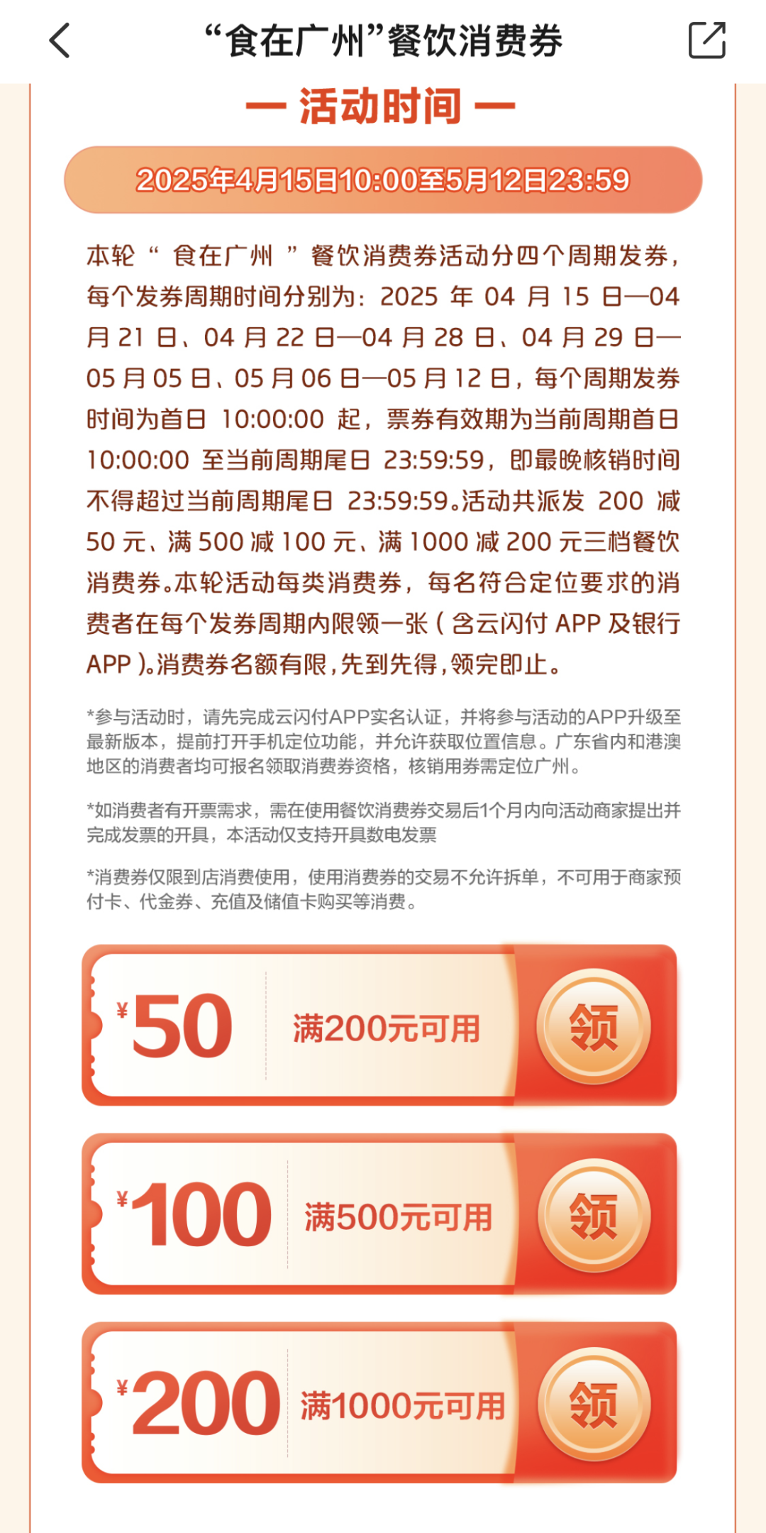 温馨提示:“食在广州”消费劵是否可叠加使用100元餐饮返现劵,以活动商户MCC码是否符合100元餐饮返现券MCC为准。