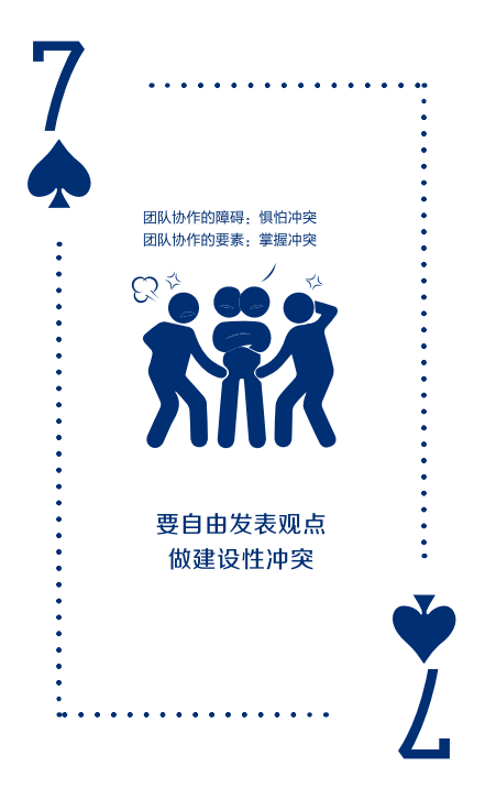 亮“「掌握冲突」牌 —— 要自由发表观点,做建设性冲突”,团队成员可以围绕团队的重要问题和决策,进行热情、毫无保留地良性争论。