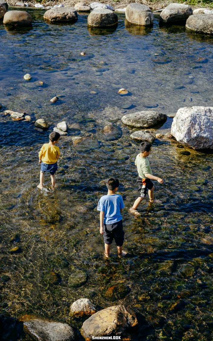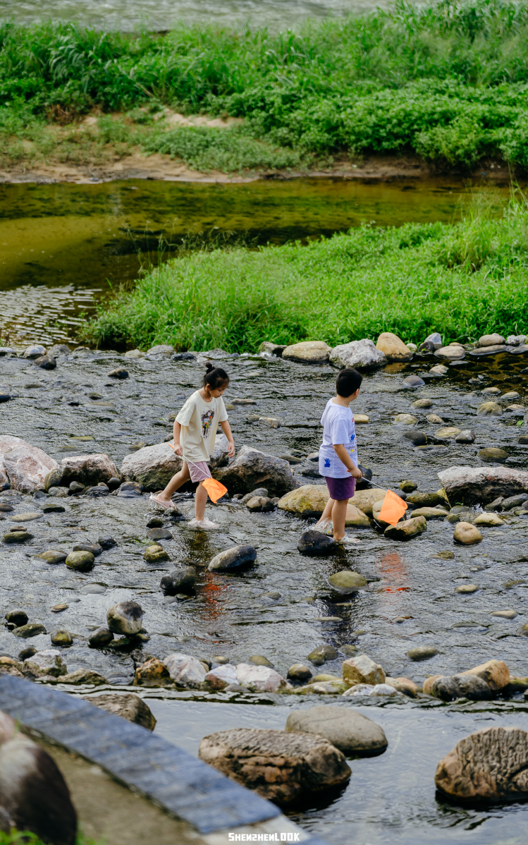从自然博物馆西站出来,便能看见蜿蜒的坪山河。以石头为桥,连接两岸,河水清浅,刚没过孩童们的脚踝处。