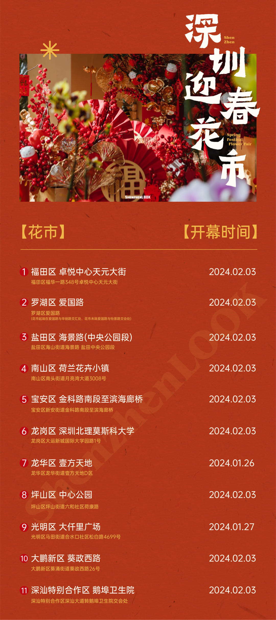 “深圳人的年味从逛花市开始”。自1月26日起,深圳2024的迎春花市将陆续启幕,今年各区共设迎春花市11个,购花点300+个,档位4700+个。除了大家熟悉的罗湖爱国路迎春花市、福田迎春花市之外,深圳还将迎来首个空中迎春花市——宝安廊桥花市、以及龙岗迎春花市等等。出发一起买花!装点新年好心情~![]()