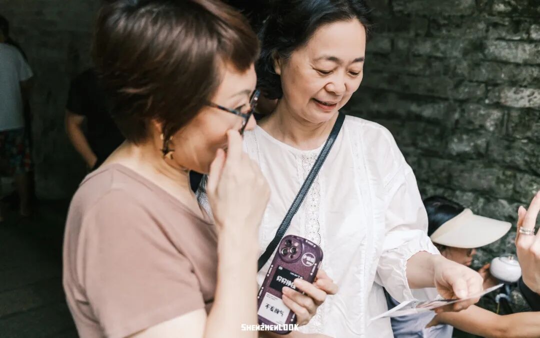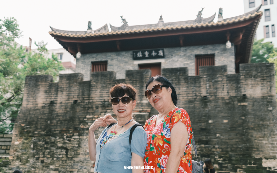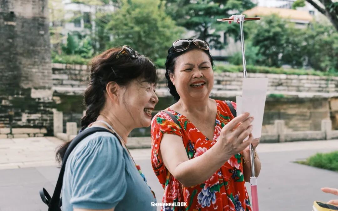 两位精心打扮的阿姨,举着自拍杆,摆着设计好的pose,在城门前记录着她们游玩瞬间,满是对生活充满热情的模样。