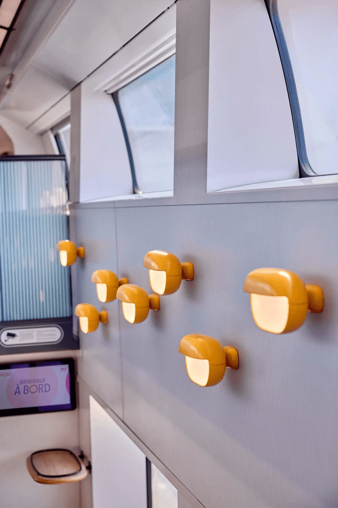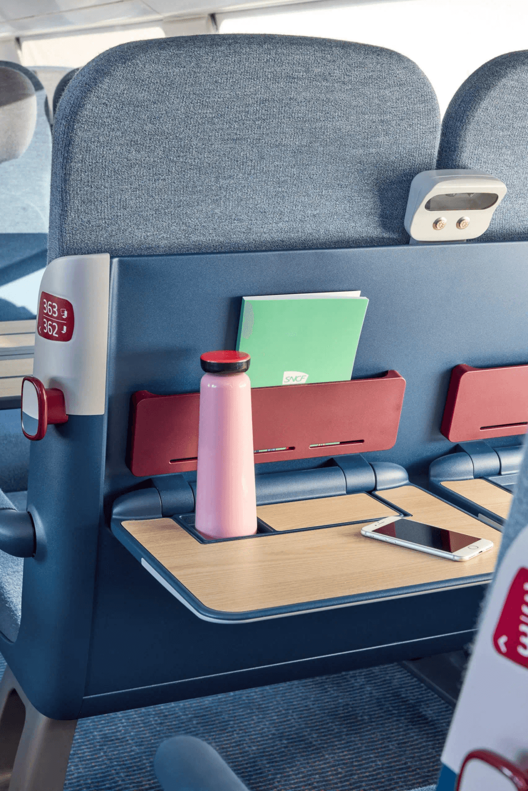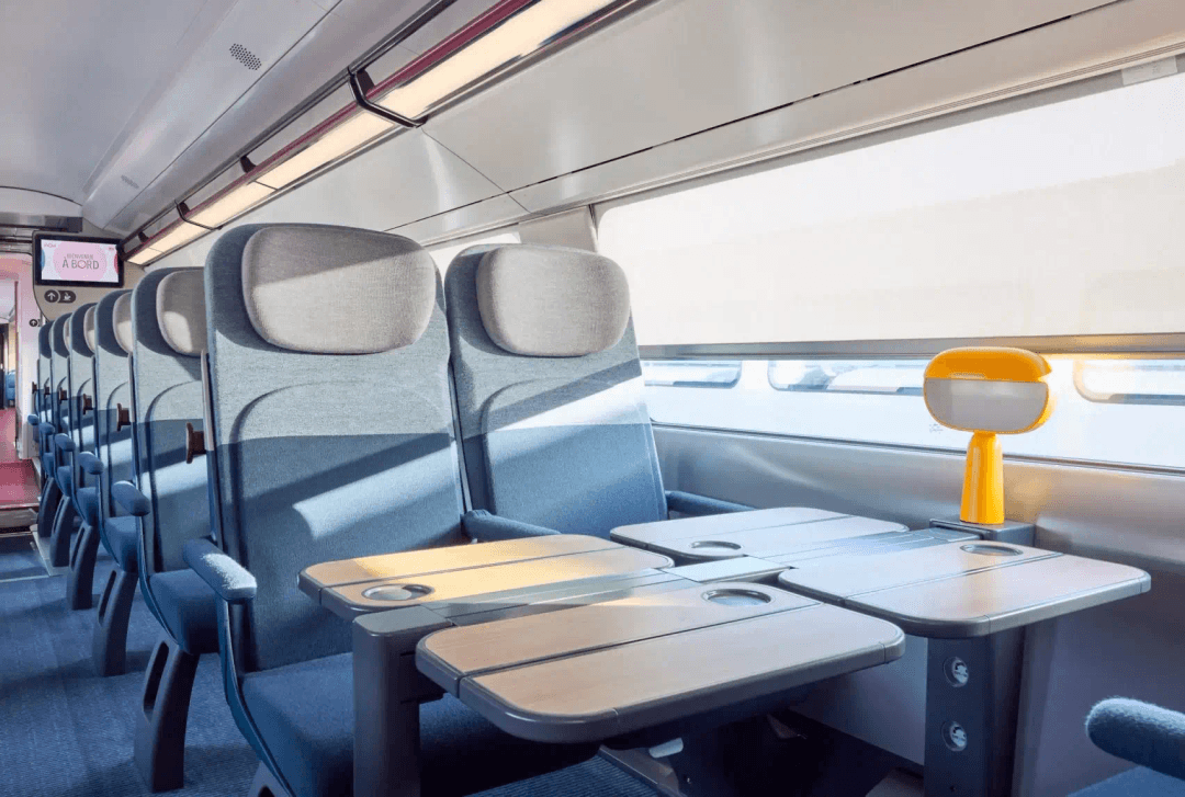 火车旅行,也可以让人很享受:法国第五代高速列车 TGV Inoui 由国 AREP 公司和日本 Nendo 设计公司共同设计,与一般列车常用的灰、白、蓝色调不同,TGV Inoui 以红、蓝、黄为主色调,并以圆润的造型点缀。