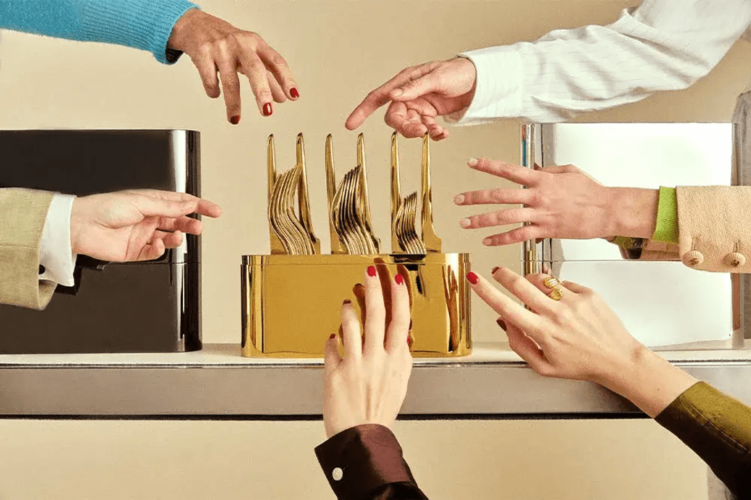 这套餐具专为宴会设计,盛装于白橡木与钢制匣中的餐具深深汲取了品牌传统精髓,餐具手柄上装饰的 milleraiès 花纹在亮面与哑光质感间形成巧妙对比。同时,刀叉勺握持手感极佳。