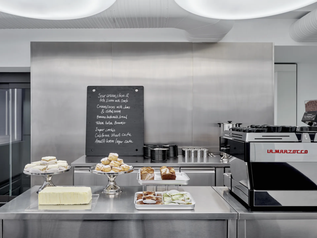 法国时装品牌 Alaïa 在伦敦旗舰店顶层新开设的咖啡厅和书店,为零售业态注入了令人欣喜的新元素:咖啡厅中央摆放着一张铝制长桌,供应由伦敦 Violet 烘焙坊提供的馥芮白、抹茶拿铁和精致糕点。