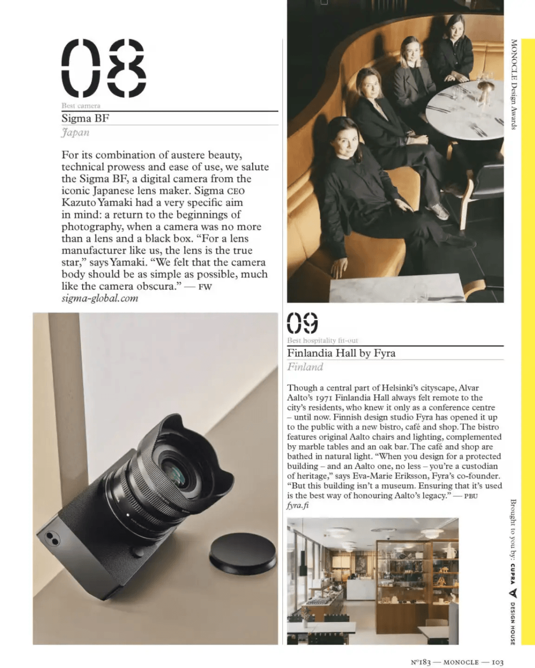 一个媒体品牌,要权威到什么程度,才能推出足够有信服力的奖项?答案就写在我们读到的这份获奖名单中:奖项中涉及的所有图片,即使只是中规中矩的产品“证件照”,都出自 Monocle 的摄影师之手;获奖者的引言,背后可能是编辑们穿越大洋的探访。