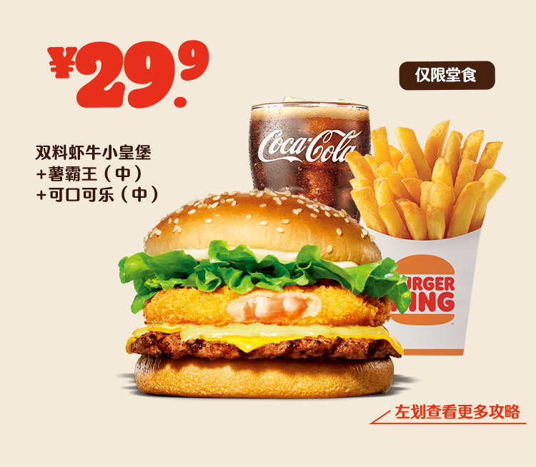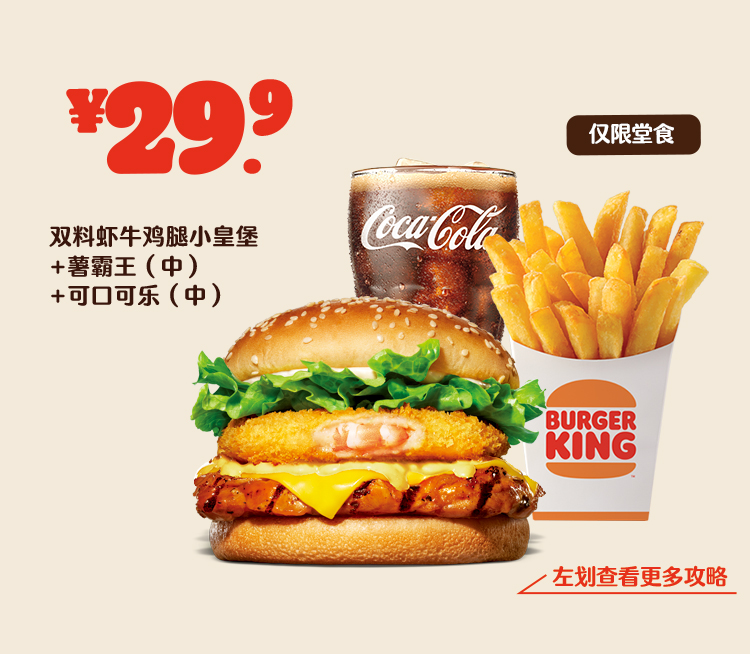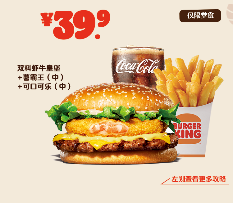 *非外卖渠道价格解释:图示如有划线价格,并非指原价,而是指不参加优惠活动情况下该产品在汉堡王指定门店销售的常规价格(或者指其中所含单品的常规单买价总和)或汉堡王门店建议零售价。除非图示另有解释,否则图示如有节省的金额或折扣比例,是与不参加优惠活动情况下在汉堡王指定门店单独购买该产品的常规价格(或者其中所含单品的常规单买价总和)或汉堡王门店建议零售价相比较。若需要查询当前门店销售的常规价格,可查看相应门店菜单或详询店员。