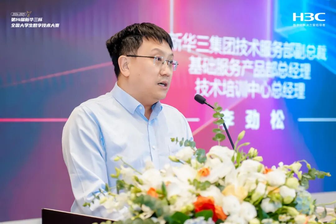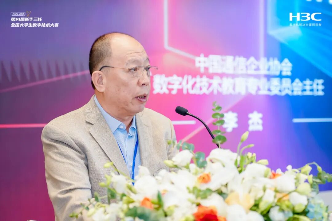 新华三集团技术服务部副总裁、基础服务产品部总经理、技术培训中心总经理 李劲松中国通信企业协会数字化技术教育专业委员会主任李杰在致辞中表示,本次大赛聚焦数字技术前沿领域,不仅检验了大学生的专业技能,更激发了他们的创新与协作潜能,充分展现了数字技术领域新生力量的无限可能。作为推动数字化技术教育发展和人才培养的重要力量,委员会始终致力于促进产教融合,而此次竞赛正是这一理念的生动实践。李杰希望同学们以此次竞赛为新起点,秉持探索精神和科技报国的初心,为国家的发展贡献青春力量,推动数字技术与产业的深度融合。协会也将继续与新华三等企业携手,深化产教融合,搭建更多实践平台,助力青年人才成长,为行业的高质量发展筑牢人才根基。