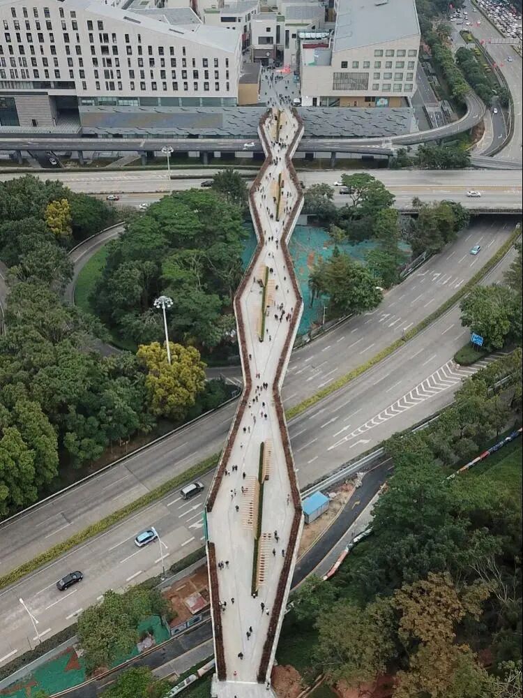 在这方面,深圳深业上城就特别建造了空中走廊来连接莲花山与笔架山,这条全长约 1.2 公里的空中廊桥方便市民在两大公园之间快速穿梭,还巧妙地将自然景观引入商业空间;成都此地 CyPARK 则利用其项目二层与城市骑行道直接相连的优势,大众可直接通过项目二层骑进或骑出,除此以外,台阶上的自行车滑道、单车专用电梯、各层均配备的骑行驿站等设施都为骑行爱好者带来极大的便利,增强了与周边骑行道及人行步道的连接。