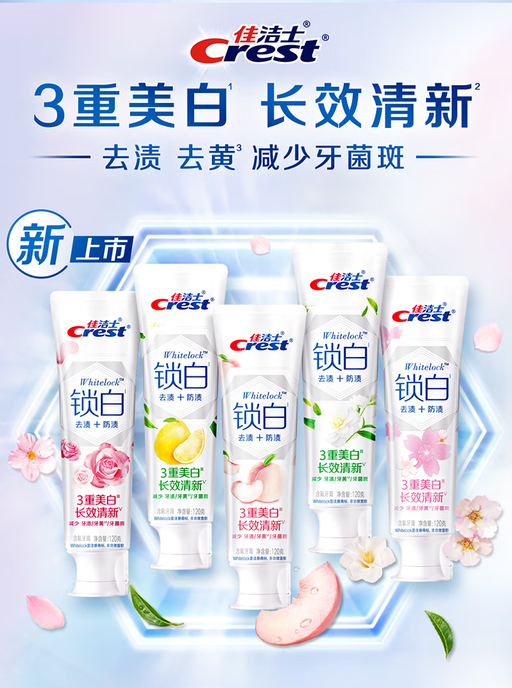 为此,佳洁士在2018年推出双色锁白牙膏,去渍同时更防渍¹,实现长效美白²,多种花果香口味让消费者时刻拥有自信清新的口气,精准聚焦牙黄与口气重这两大难题。