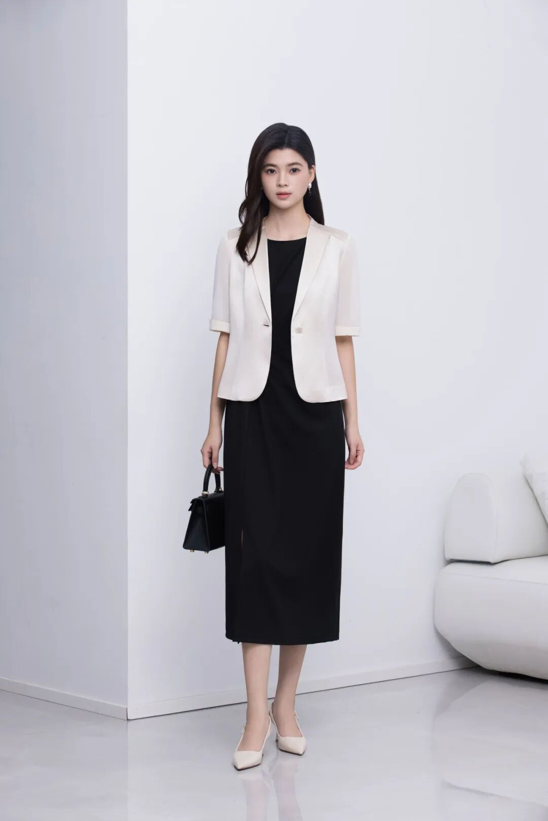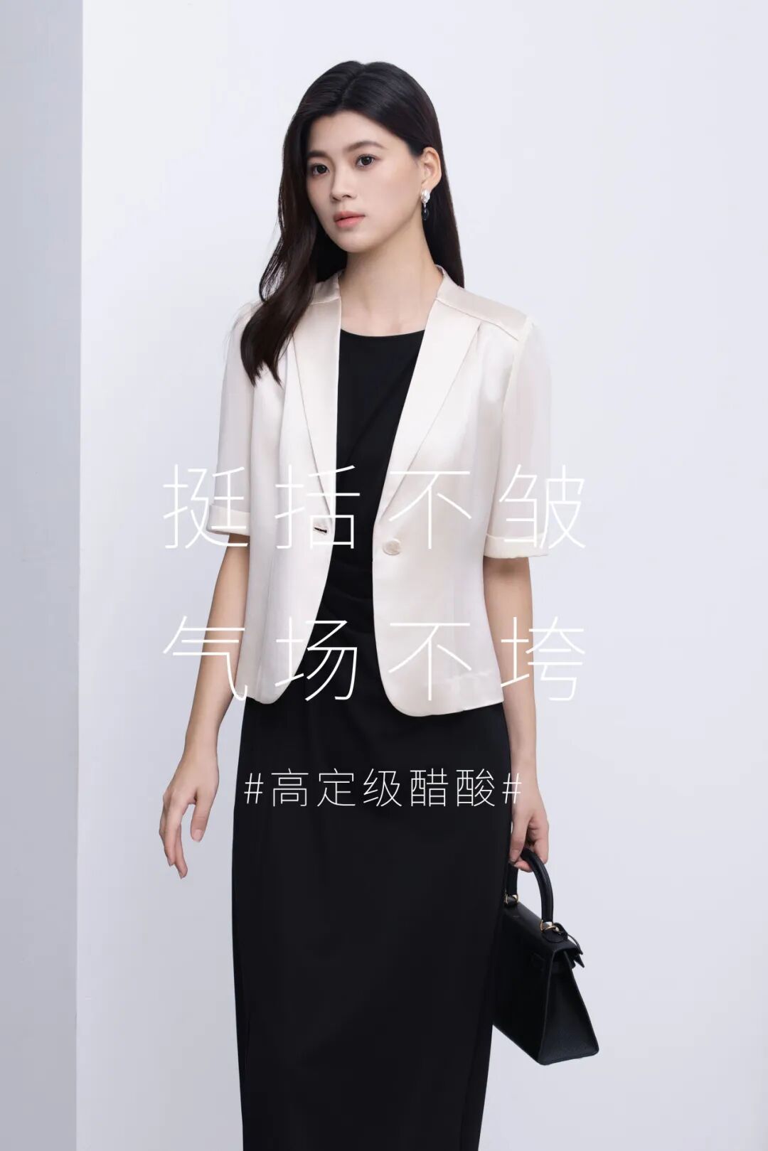 采用高定专属醋酸面料,兼具挺括筋骨与柔滑触感。每一道缝线都彰显高级定制般的精准,每一个轮廓都体现Clean Fit的极致追求。这是专为睿智女性打造的通勤战袍。