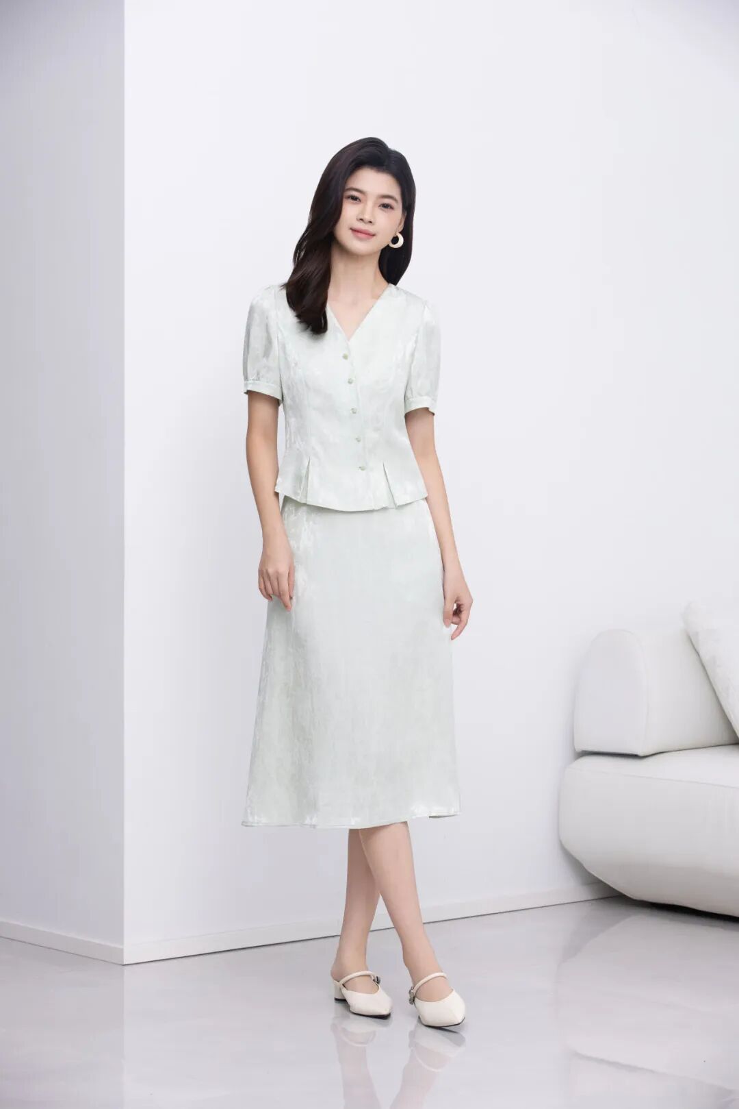 备受顶级奢侈品牌青睐的天丝麻,以独特的肌理感与水绿色调演绎新派东方美学。穿着者无需言语,面料本身就会诉说她的文化底蕴与不凡品味。