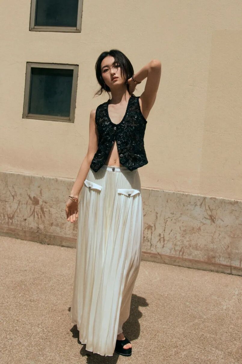 品牌形象大使张子枫身着CHANEL 2024/25高级手工坊系列山茶花刺绣马甲,真丝褶饰阔腿裤(款式52),佩戴CHANEL高级珠宝N°5 系列ETERNAL N°5耳环、手链与手镯亮相戛纳电影节