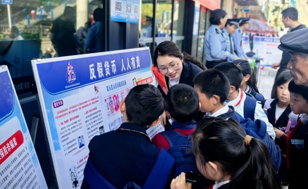 ▲工行贵州毕节威宁支行在网点外设置金融知识宣传点,为小朋友们讲解人民币防伪相关知识。