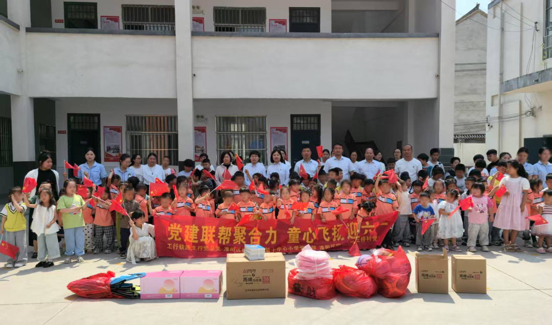 六一儿童节来临之际,工行河南周口铁路支行党总支、机构金融业务部党支部,携手周口市淮阳区柳湖街道第十中心小学党支部、淮阳区柳湖街道左桥村党支部,共同开展“党建联帮聚合力,童心飞扬迎六一”党建共建活动。在活动现场为孩子们赠送彩笔、文具盒、书包、篮球、羽毛球及文学书籍等礼品,并提前送上节日祝福。