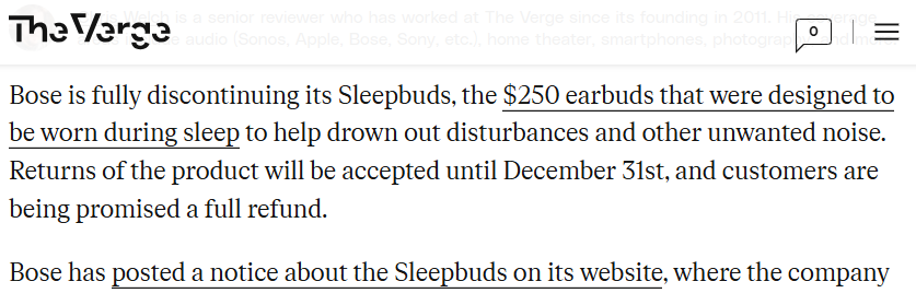 同时,由于 Sleepbuds 推出时间较早,Bose 当时的技术支持并未跟上。Sleepbuds 一代出现了无法充电的情况,这样一来真的就和几十块钱的耳塞无异了。其当时售价为 249 美元,这个价格换来一副“美丽废物”,显然不是用户们能轻易接受的。随着购买者反映的电池问题越来越多,Sleepbuds 一代推出不到一年就被紧急召回并遭遇停产。Sleepbuds 二代除了上述内容增加和改进了无法充电的硬伤,据公开信息来看也无其他更新了。