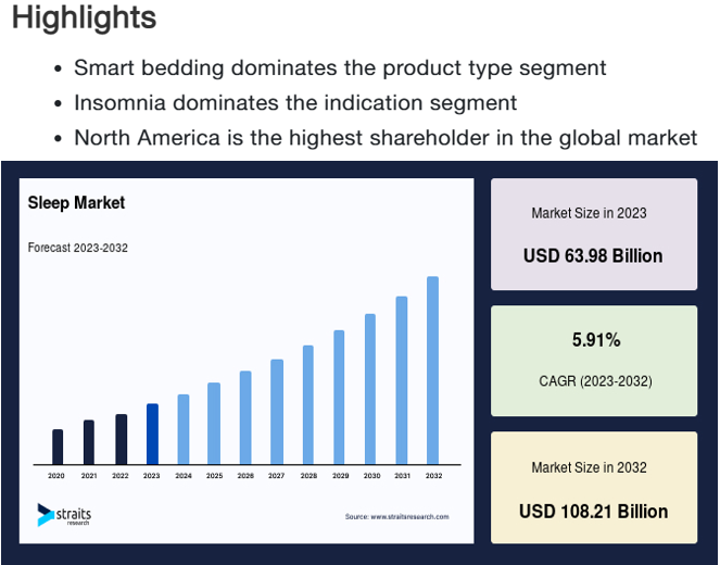 但商家当初想以助眠为卖点打入东南亚市场的想法,也并非没有依据。据 Straits Research 的数据显示,2023 年全球睡眠市场规模价值为 640 亿美元,其中,北美占据了 42.1% 的市场份额。预计到 2032 年,全球睡眠市场规模价值将突破千万亿美元大关。