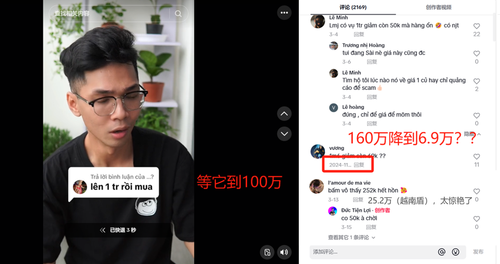 凭借对耳机防水性能的宣传,再搭配上不影响睡眠、具有隐蔽性,以及耳机约 60 左右单价的设定,越南用户为此疯狂买单。而面对这样全能选手与低价的违和感,达人们也用跳水降价为其披上了合理的外衣。