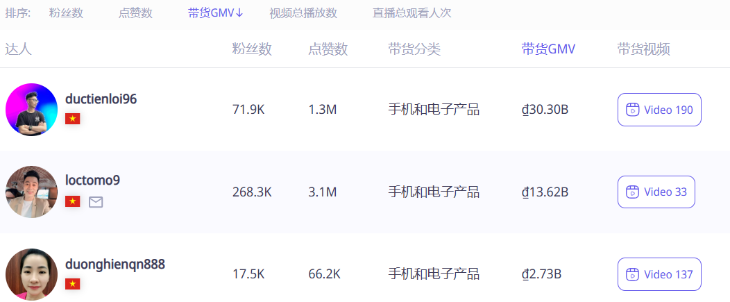据 EchoTik 显示,Earbuds & Earphones 店铺中商品的 GMV 有 43% 来自达人带货(短视频+直播),共 2800 名达人推介过其旗下产品,而其中 2600 名达人带的产品就是 HQAi X55。@ductienloi96 当属这数千名达人中的 “带货王”,他是一名越南电子消费领域的小型达人,在 TikTok 上共发布了 15 条关于 HQAi X55 的带货视频,时长都在 1 分钟左右,以 7 万的粉丝量带来了 300 亿越南盾(约 116 万美元)的销售额。