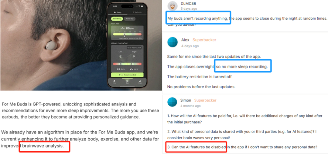 而 For Me Buds 在宣传中着重突出的 AI 功能主要应用在睡眠监测上,看起来很好,但从评价来看这个功能并不灵敏,目前已有数名用户反映没有任何睡眠记录。同时,海外用户非常注重个人隐私问题,由于 For Me Buds 主要是依据心率和脑电波数据监测,再通过 AI 分析给出睡眠建议,不少用户认为脑电波是非常私人的数据,很介意这一点。