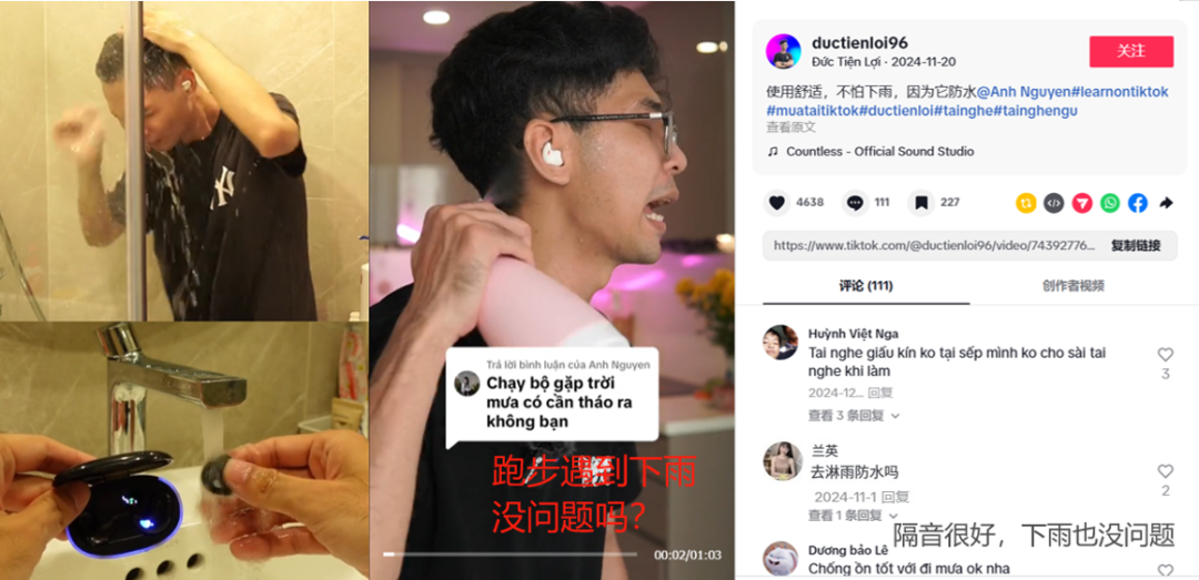 起初在 2024 年 9 月发布相关视频时,@ductienloi96 的内容就是按店铺简介中那样宣传产品的主要特点,然而评论区的留言似乎并不那么注重它助眠与否,最吸引人的卖点恰恰是其防水功能。于是博主的视频也根据评论区的问题开始“整活”带货,耳机泡水、戴着耳机洗澡,遇水后仍然播放如常。除了每期必讲的贴合耳形不影响侧躺这个特点,前前后后有 8 期视频都在强调 HQAi X55 强悍的防水性能,播放量大多在 800 万左右。