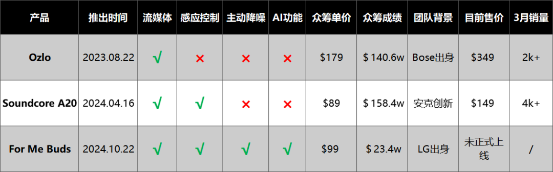 For Me Buds 所属公司 dbbeats 由前 LG 工程师创立,脱胎于 LG 在 2023 年发布的助眠耳机 bird.zzz,这一点和 Ozlo 有相似性。For Me Buds 自己似乎也不太满意 Kickstarter 上的众筹结果,于是最近转战韩国市场,但将众筹价格提高到了 170 美元,目前约筹得 3.5 万美元,在该众筹平台科技类目中处平均水平,也不算太好。从众筹社区的评论来看,大多数韩国用户对这款耳机仍持观望态度。