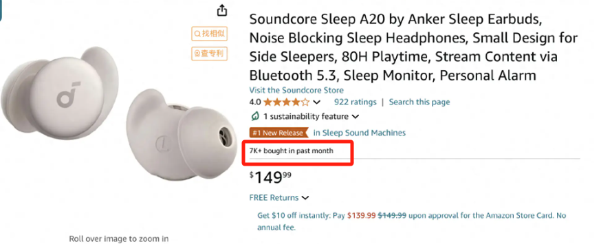 去年 9 月左右,亚马逊上一款国产助眠耳机月销售额突破百万美元的实例也印证了海外睡眠市场的潜力。Soundcore Sleep Earbuds A20(下称 Soundcore A20)来自安克创新,不同于 HQAi X55“无心插柳”地以防水性能走红,Soundcore A20 则实打实地以佩戴舒适、隔音好、续航长等助眠属性俘获了用户。因此即使 Soundcore A20 售价高达 150 美元,也能在一个月内卖出 7000 多副。