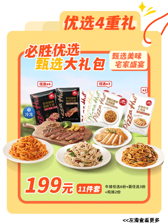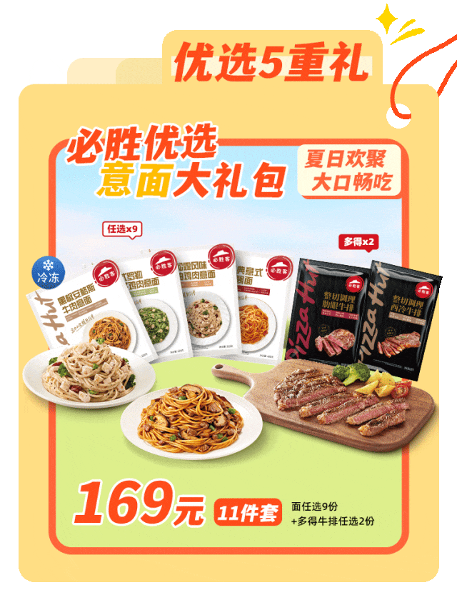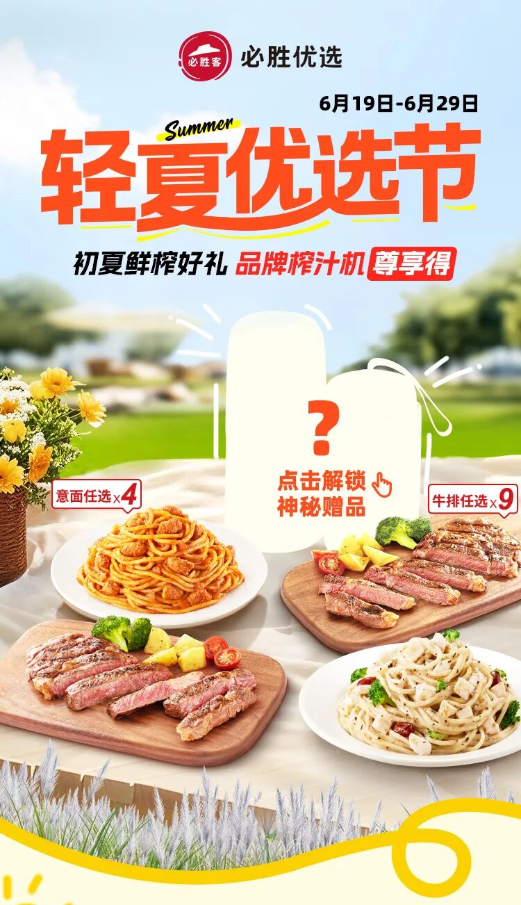 优选节活动间:2025年6月19日至2025年6月29日,活动期间可在必胜客自助点餐-外带自取/必胜客宅急送渠道购买上述套餐,具体产品及价格请以点餐渠道中的菜单内容为准。本活动不适用于LesElites以及部分必胜客特定餐厅,请详洽餐厅。