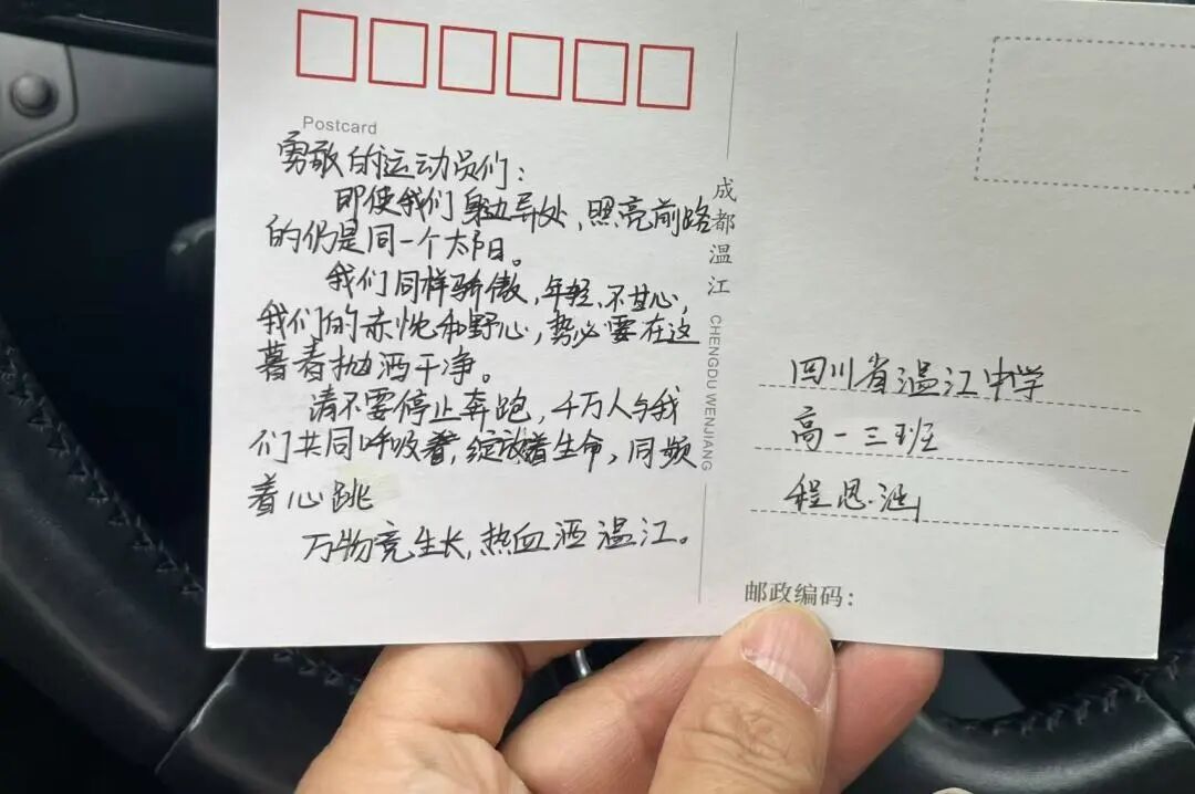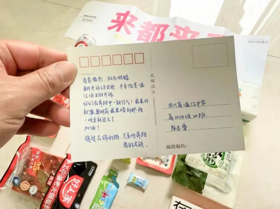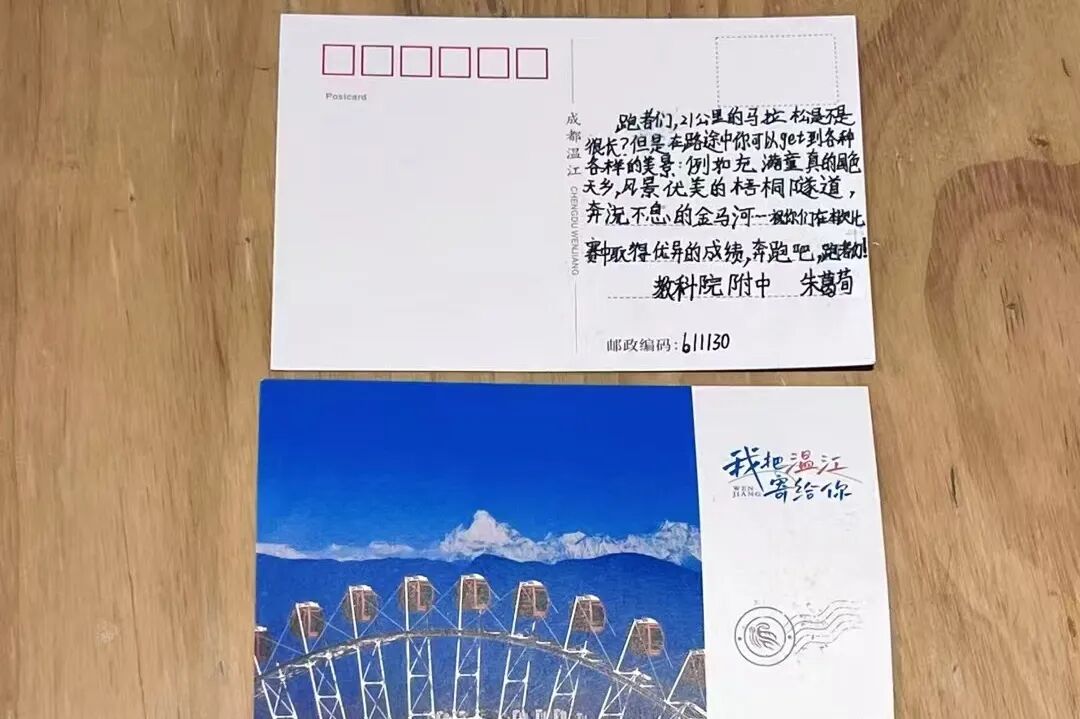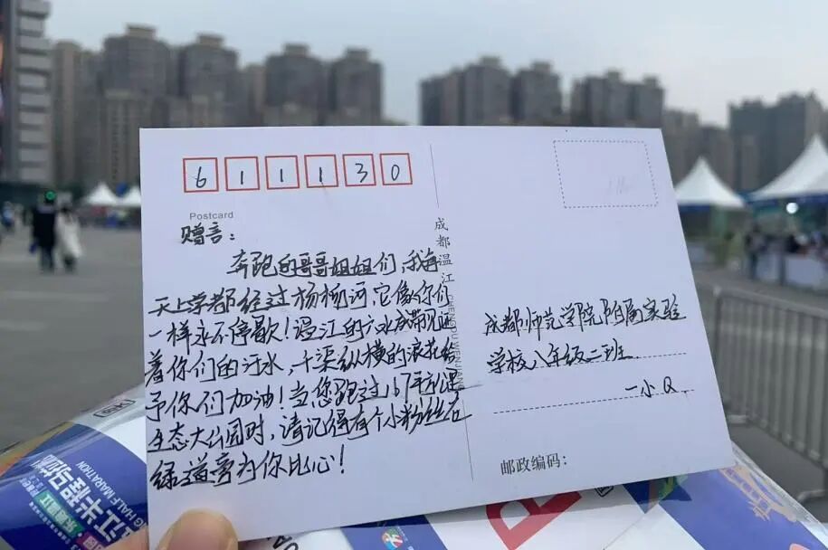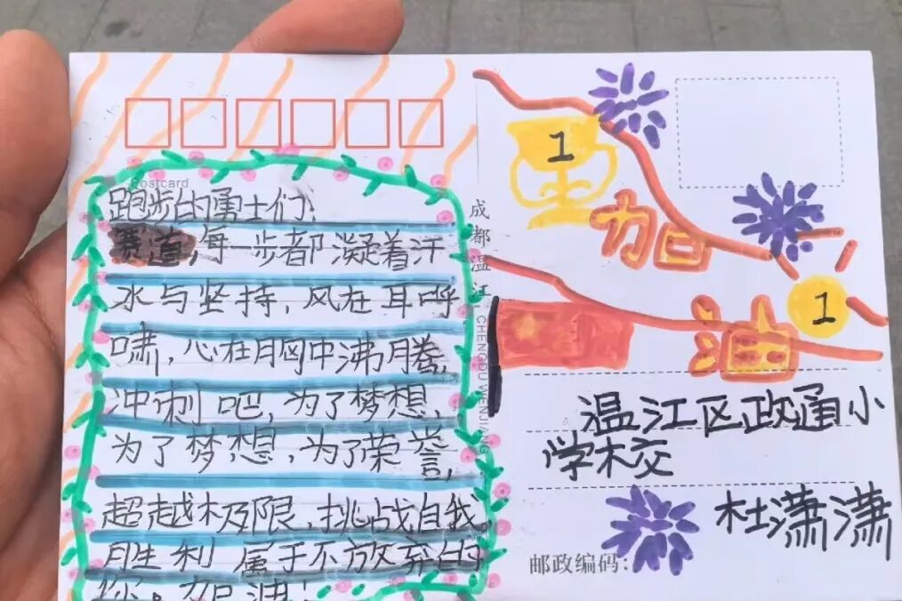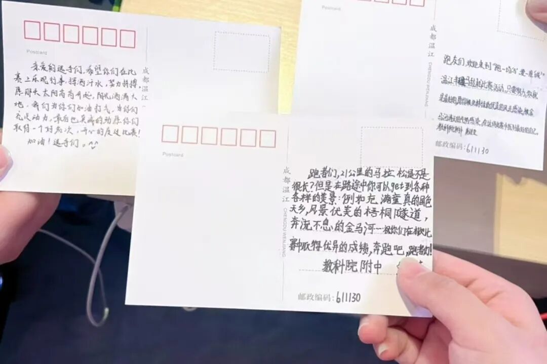 据了解,温江发起“奔跑寄语”主题活动,以温江城市文化地标为背景定制赛事专属明信片,发动区内中小学生手写祝福语,既为参赛者打造沉浸式文化体验,又通过孩子们的深情祝福为选手传递温暖,形成赛事服务与城市文明建设的双向赋能。