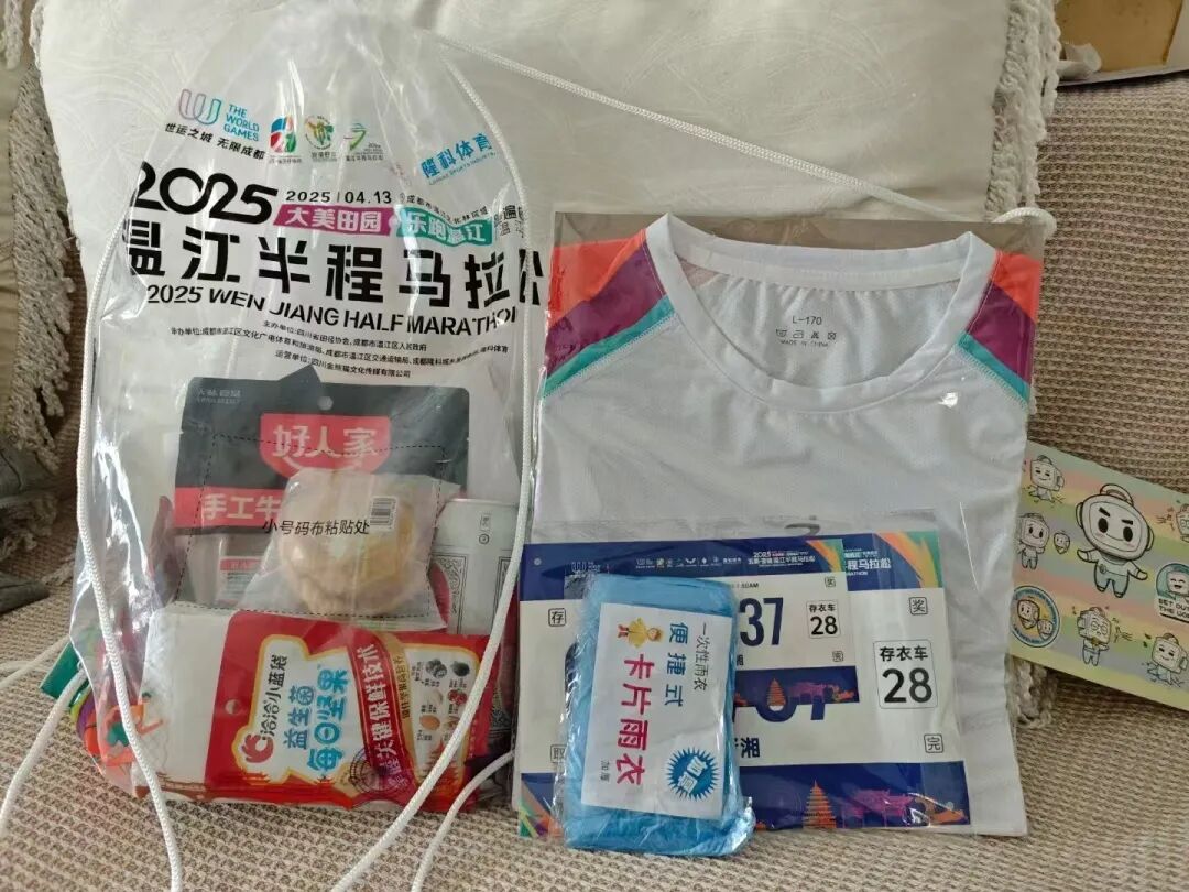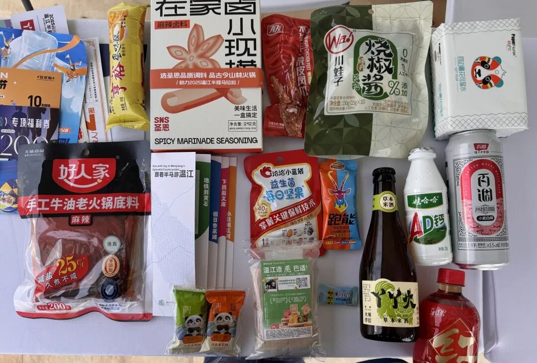 参赛包十分丰富且“温江造”元素满满,不仅配有补给能量的能量胶和盐丸,也有圣恩麻辣卤料、统一冰红茶、娃哈哈AD钙、佑贝本草药食同源蒸面包等“温江造”产品,还有好人家火锅底料、蛋味酥饼干、虎皮凤爪、川娃子烧椒酱、纸巾、啤酒、坚果等补给物品,此外还有一份跟着半马游温江的册子以及各种福利券。