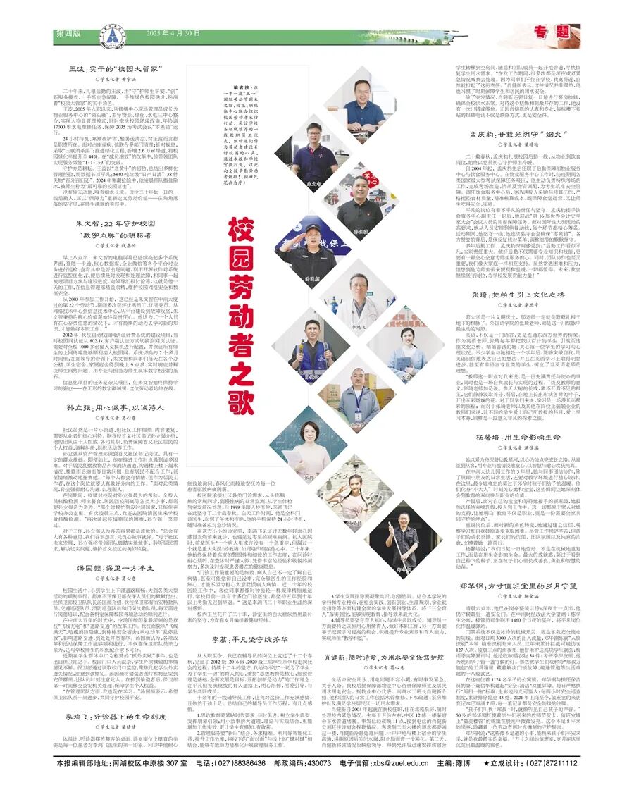 2005年入职以来,从修缮中心现场管理员到物业服务中心的“领头雁”,参与物业、绿化、水电三中心整合的大物业管理模式改革和校园环境改造,王波以“老黄牛”的韧劲,用数据书写平凡:24小时待机,5840吨垃圾“日产日清”,年协调17000单水电维修任务,保障2035场考试会议“零差错”运行......2024年“战冰雪”中,他凌晨带队撒盐除冰;针对蚁患,采取“三联消杀法”;和后勤战友们一起推进绿化工程,将校园绿化率提升至44%。这位一线后勤人,坚守在校园角落,只为师生满意的笑容。