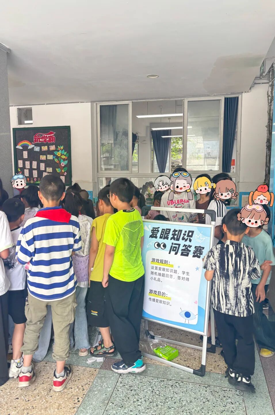 左上:在爱眼知识问答赛中,小朋友们争相对“眼球的直径”、“泪液的作用”、“预防近视的方法和食物”等100道问题给出自己的答案和见解,氛围热闹到不行的同时,眼健康知识up up!