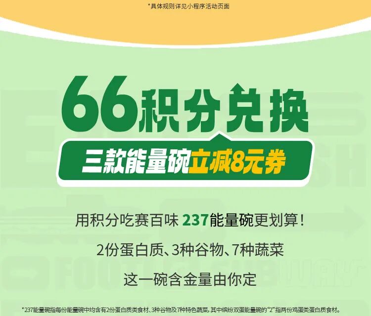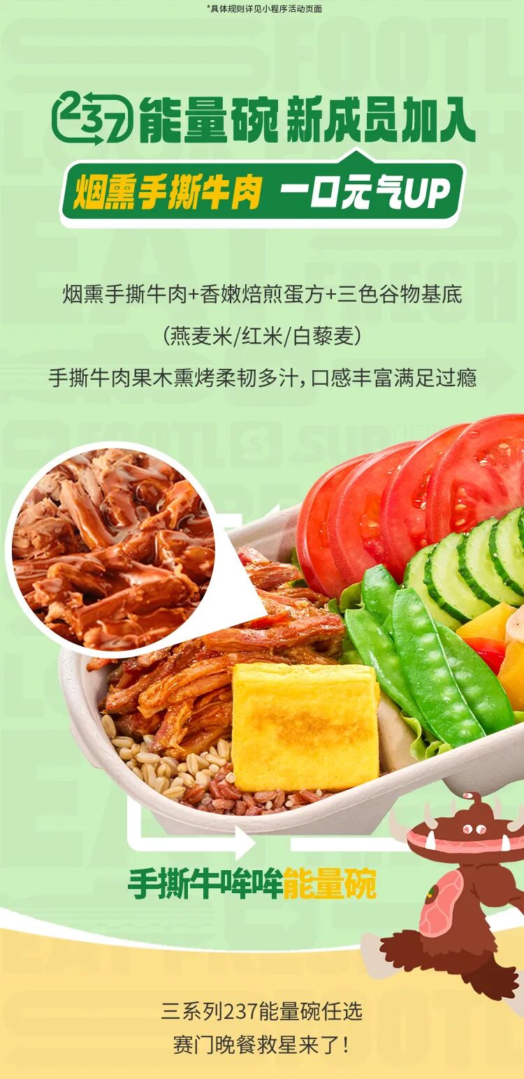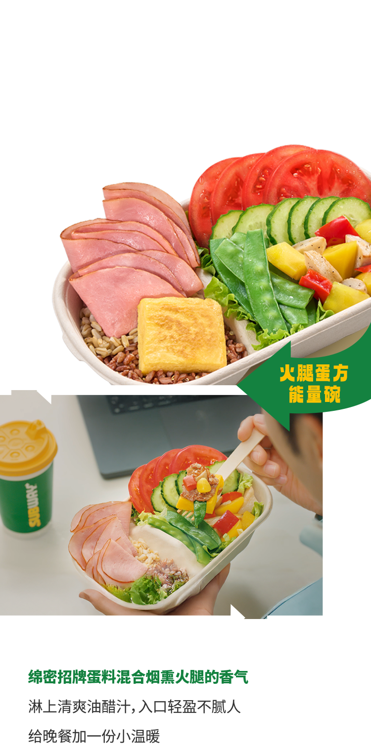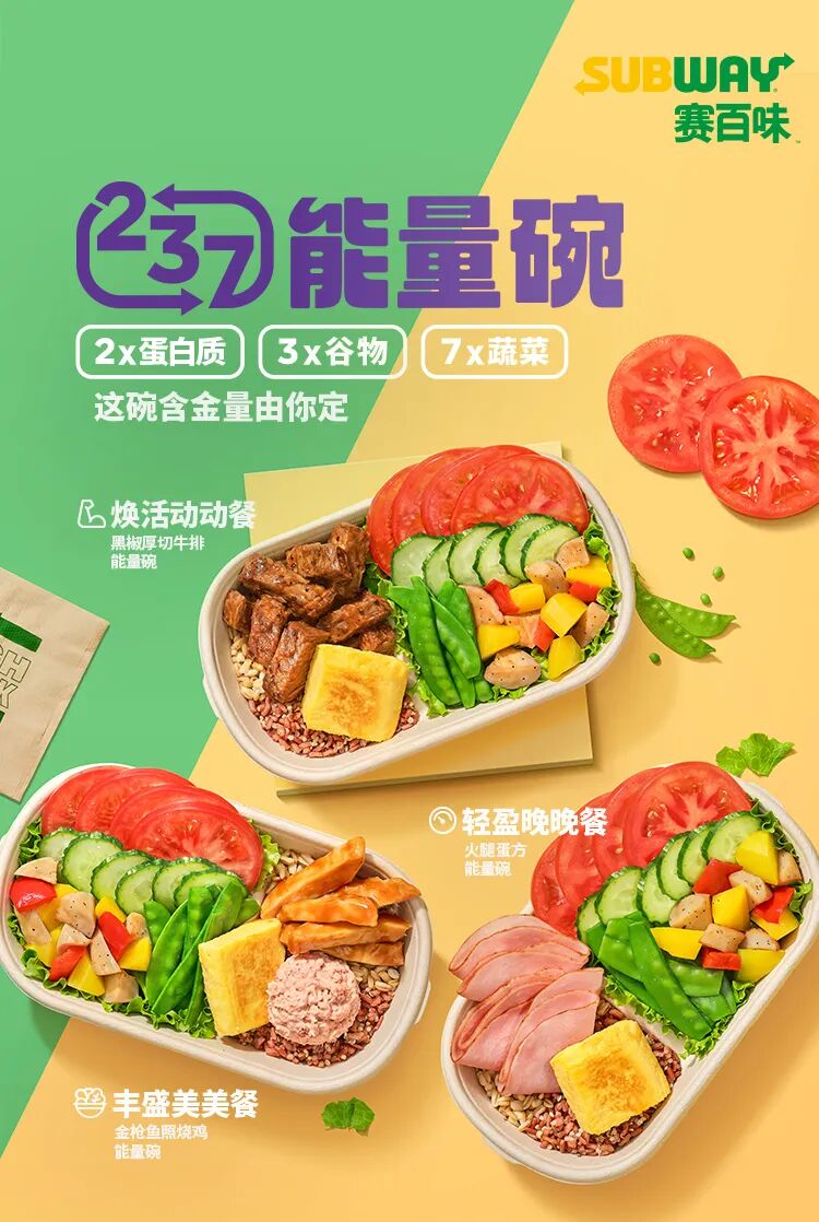 上述产品仅限赛百味中国大陆地区部分餐厅2025年4月16日起供应,具体信息请以餐厅公示为准,供应餐厅清单请查看赛百味微信公众号 - 菜单栏新鲜放送 – 能量碗在售餐厅。产品,包装及食材以实物为准,创意影像仅供参考。此菜单仅适用于堂食,不适用于外卖平台。SUBWAY赛百味可以在法律允许的范围内对活动进行适当调整。 Subway® is a Registered Trademark of Subway IP LLC © 2025 Subway IP LLC. *237能量碗指每份能量碗中均含有2份蛋白质类食材、3种谷物及7种特色蔬菜,其中缤纷双蛋能量碗的“2”指两份鸡蛋类蛋白质食材。