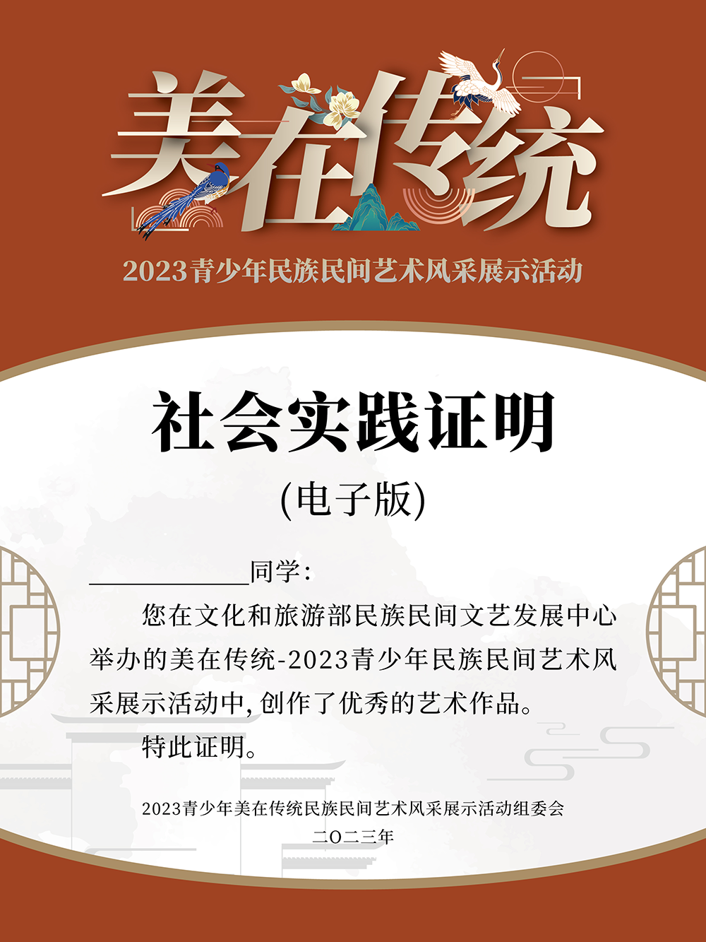 一、优秀选手将推荐参与“美在传统”青少年民族民间艺术风采展示活动总评选,并有机会荣获美在传统纪念证书与纪念品。