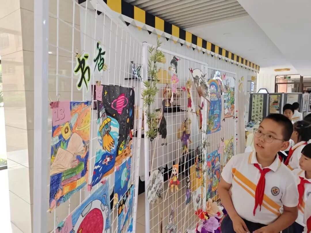 课间,学生们还在教学楼大厅发现了一道绚丽的艺术风景线——走进画展现场,一幅幅充满童趣的作品映入眼帘:蜡笔画勾勒出天马行空的想象,环保材料制作的立体手工创意十足,还有陶艺作品呈现了童真视角下的古典美,书法字帖展现出传统文化的独特魅力……