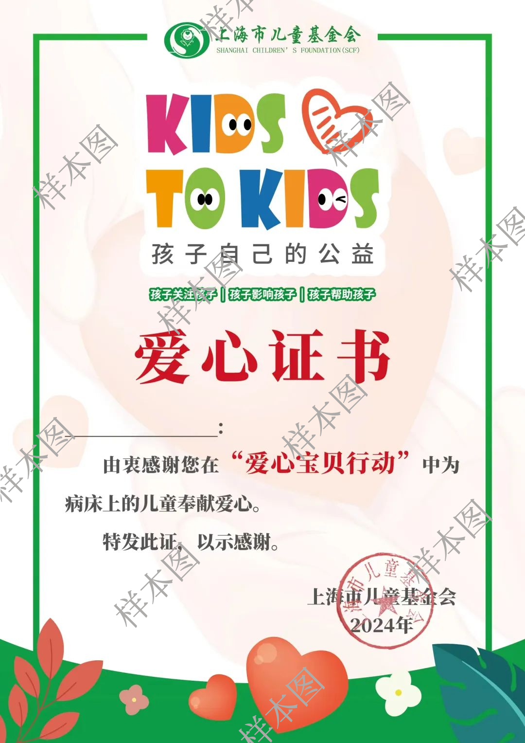 上海市儿童基金会“爱心宝贝行动”是沪上历时15载的儿童公益品牌项目。自2009年起,始终坚持Kids to kids(孩子关注孩子,孩子影响孩子,孩子帮助孩子)的公益理念,鼓励孩子们通过爱心义卖、爱心义演、爱心义展等不同的公益形式,将纯真的爱心转化为实际的行动,为病床上的儿童带去物质的帮助和精神的关怀。