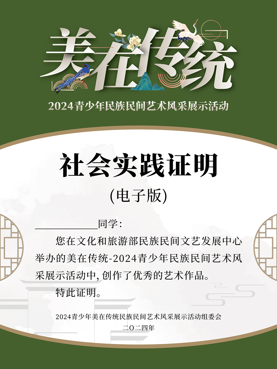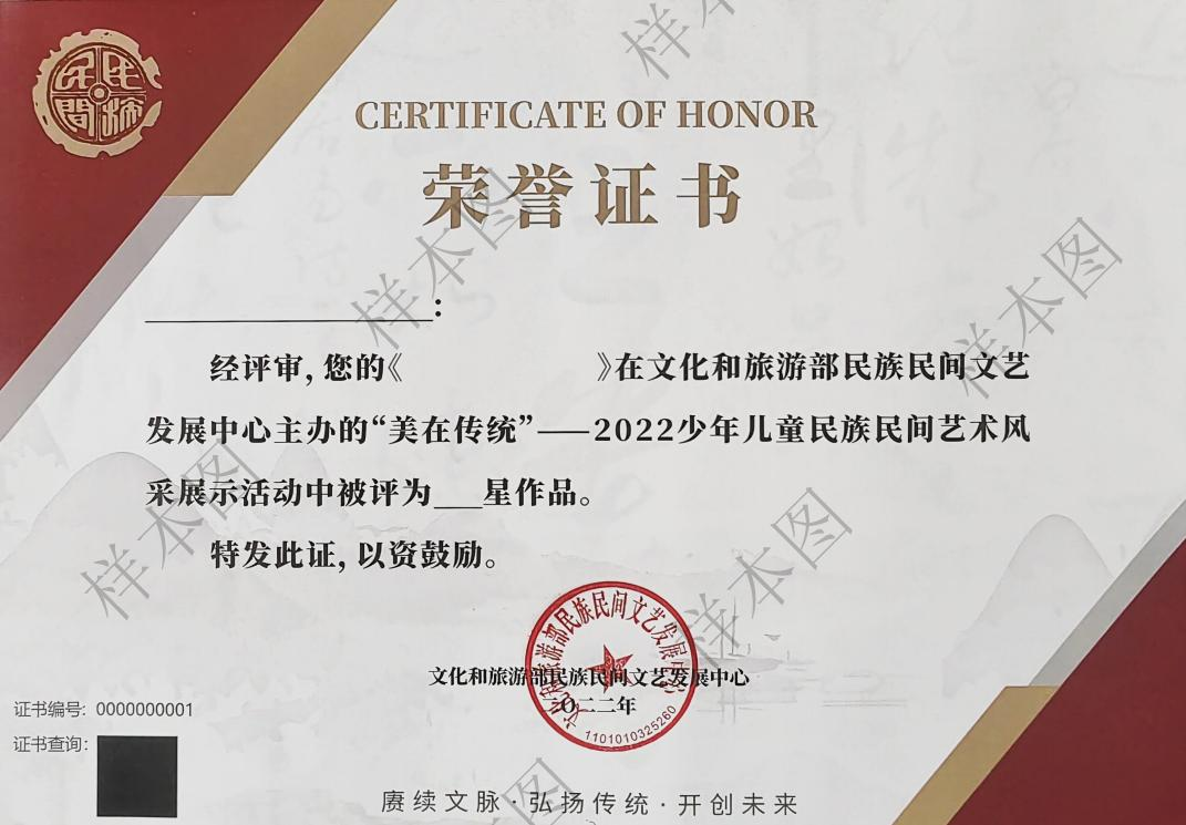 一、优秀选手将推荐参与“美在传统”青少年民族民间艺术风采展示活动总评选,并有机会荣获美在传统纪念证书与纪念品。