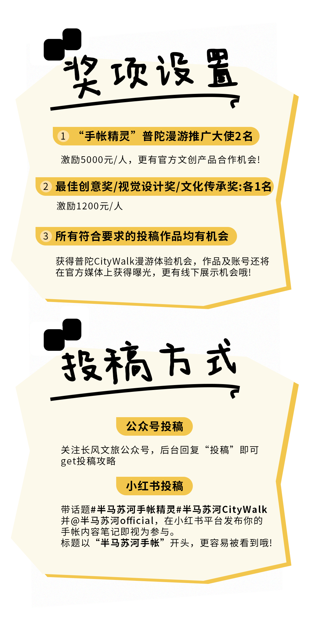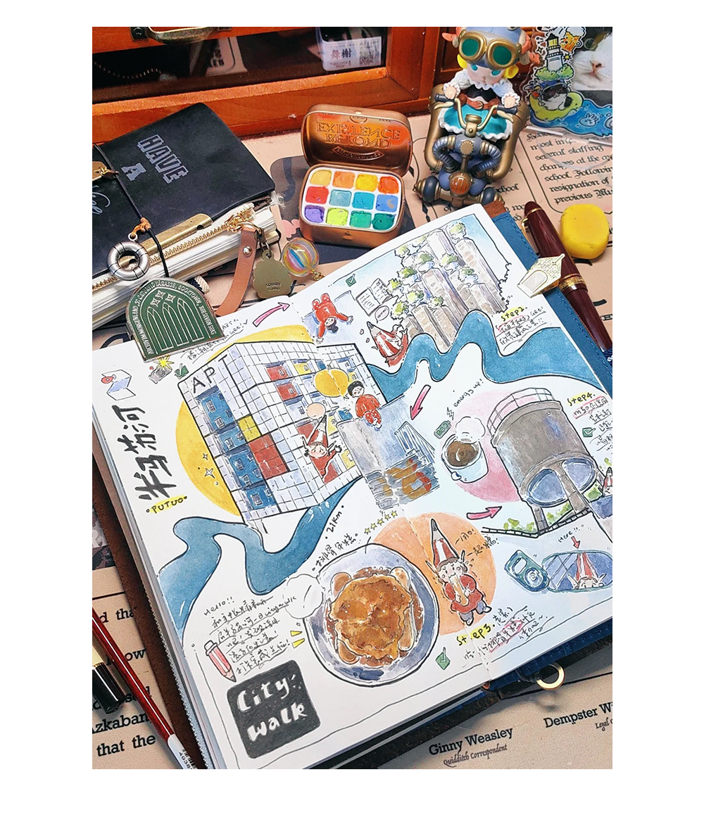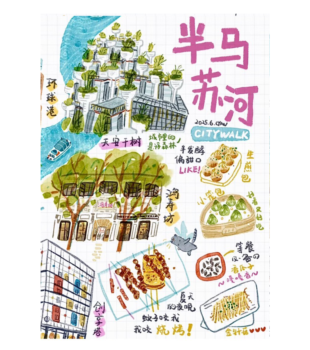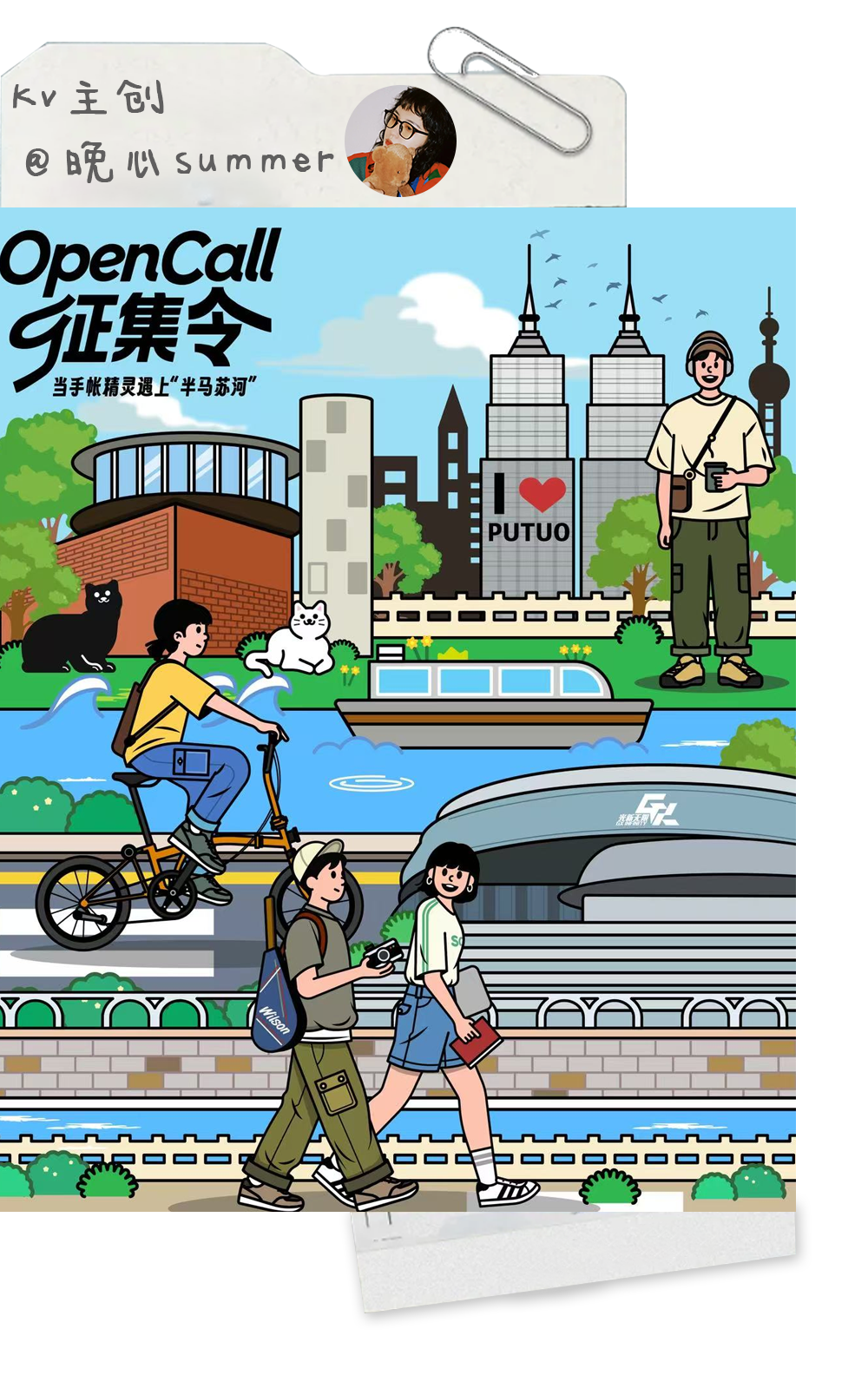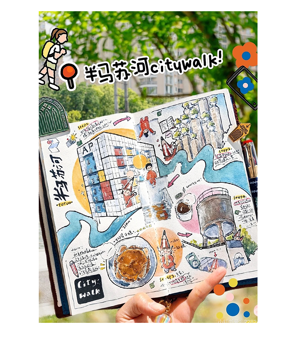 现在就揣上手帐本出发吧!沿着苏州河开启CityWalk,每个转角都是未被标记的创作灵感~即日起至6月30日,以“普陀城市漫游CityWalk”为主题创作属于你的独特手帐作品。自由发挥你的想象,手绘、插画、拼贴……技巧不限,尽情创作出独一无二的作品。