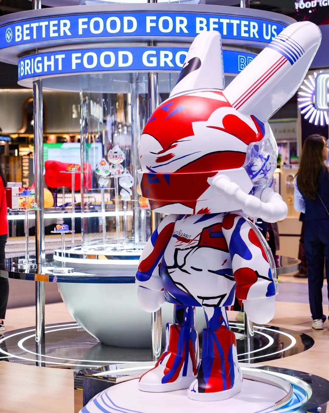 「Cyber Sweet」3000%系列则作突破了传统潮玩界限,以赛博朋克视角对大白兔形象进行创意解构,融入全新的潮流语言,将大白兔的经典红白蓝糖纸元素与ROBBi独特的未来科技感相结合。产品的整体造型汲取了大白兔奶糖的经典形象,通过赛博朋克的视觉语言进行重构,展现出充满科技感、未来感和甜蜜气息的全新面貌。