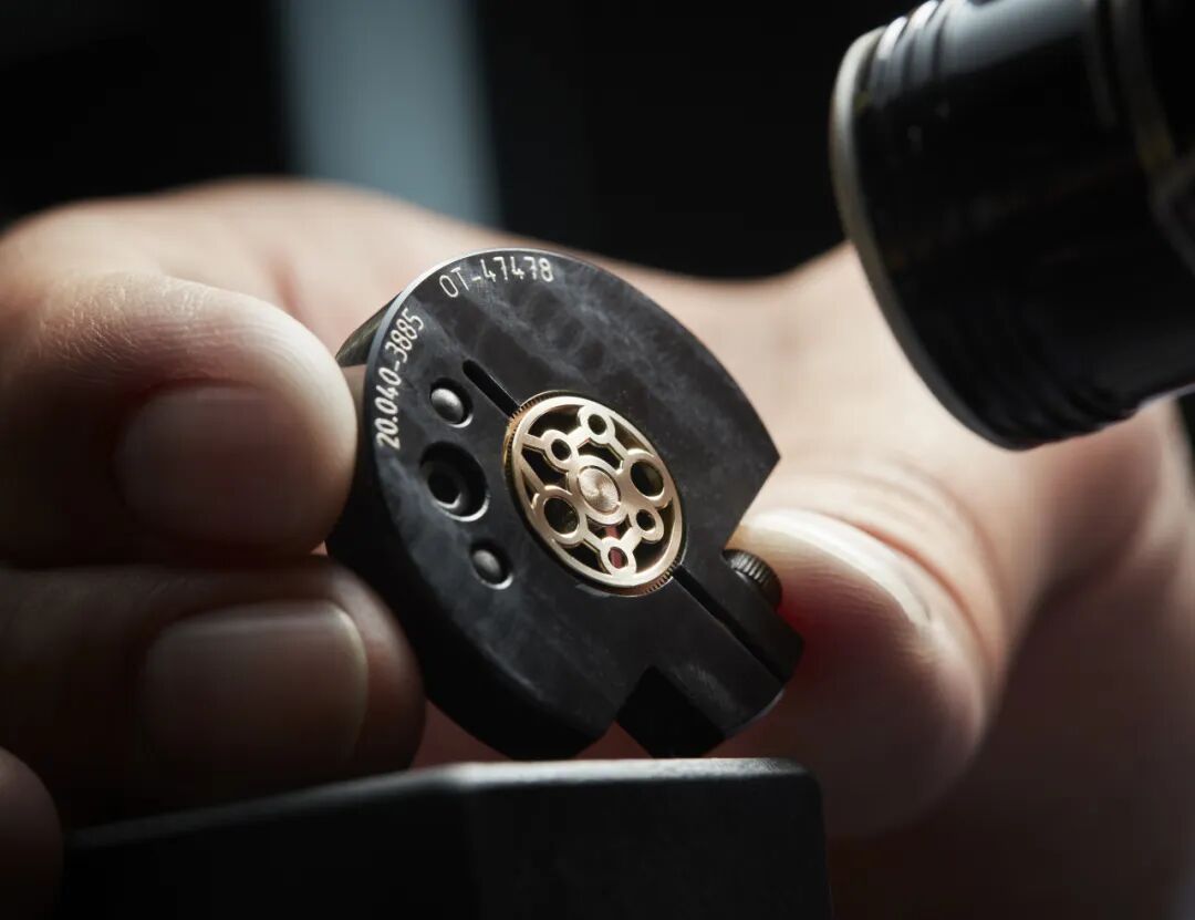 这种工艺要求将部件的锋利边缘精心打磨成 45 度的斜面,实现双重目的:一方面,它消除了可能干扰机芯运作和降低其可靠性的毛刺和加工痕迹;另一方面,通过缎面打磨与抛光之间的光影效果,营造艺术美感。