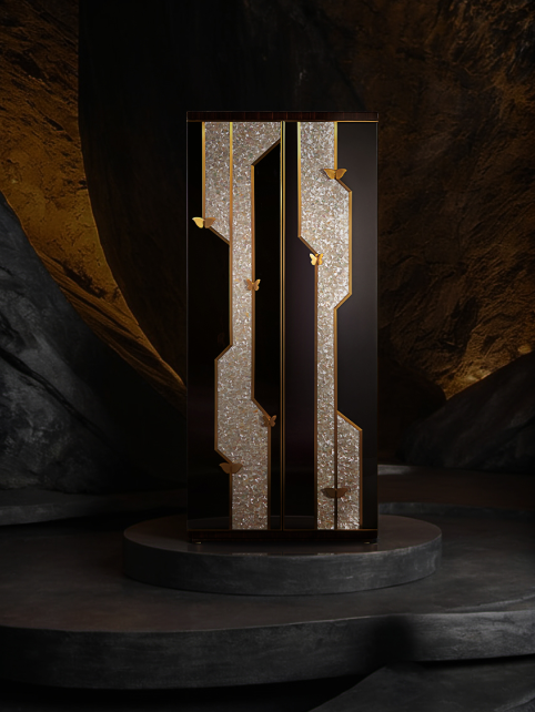 宝箱以黑檀木皮为基底,表面呈现出细腻而丰富的自然纹理,柜面点缀以母贝璀璨光泽,金色金属条优雅衔接其间,尽显不可复制的自然魅力。精雕细琢的蝴蝶装饰增添翩跹动态美感,灵动不失雅致。