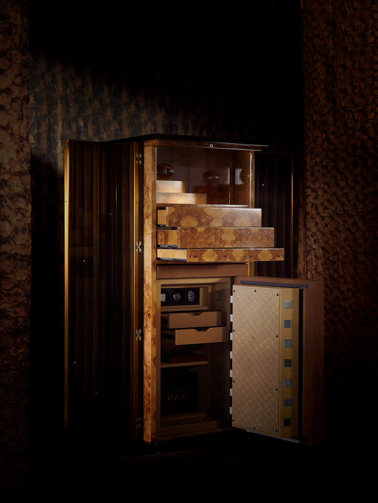 华昼私人宝箱柜体源自德国精密制造,内嵌结构采用国际顶尖奢侈品同级别的意大利皮革包裹,赋予真皮无与伦比的品质与美感,摇表器则由瑞士原装进口。每一处细节都凝聚了世界各地的精湛技艺与卓越品质,共同铸就非凡底蕴。