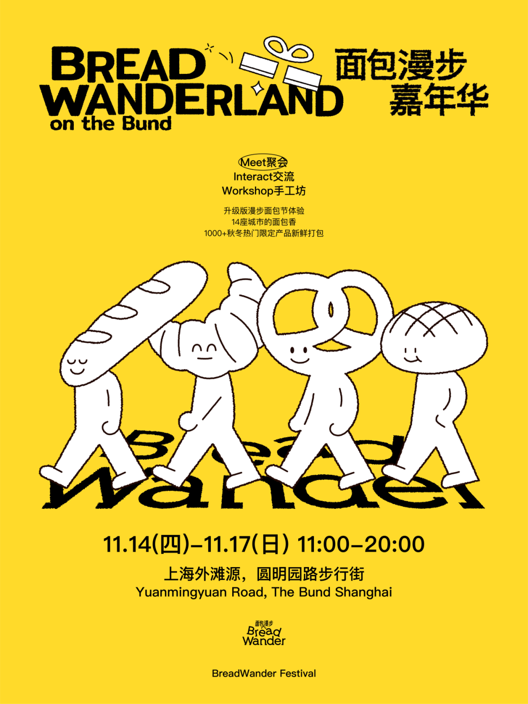 “面包漫步嘉年华”活动将于11月14日至17日,每日11:00-20:00在上海外滩源·圆明园路步行街举办。本次活动以「礼物」为题,让有趣的烘焙品牌和面包爱好者们有机会深度交流。