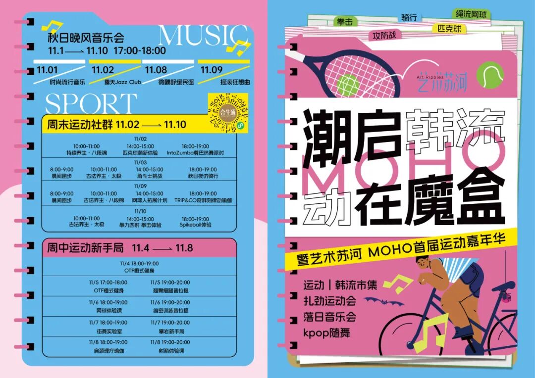 11月1日-11月10日,“潮启韩流 动在魔盒”暨艺术苏河 MOHO首届运动嘉年华将围绕项目新定位,串联室外广场与室内空间,为市民游客呈现为期十天的集赛事、休闲、社交、商业于一体的体育运动狂欢盛宴。近40场全新运动体验,解锁潮流运动酷玩法;跨界融合“萌宠”和“韩流”,打造多元消费新场景;更有2大主题社区运动比赛,激发全民健身新活力。