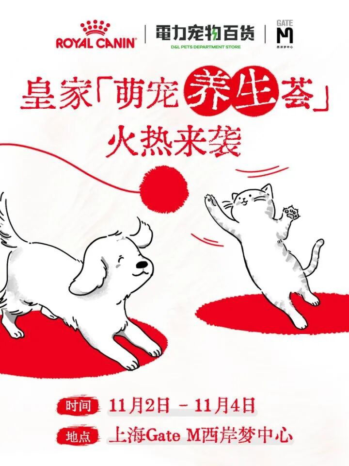 皇家【萌宠养生荟】11月2日-11月4日上海Gate M西岸梦中心市集广场举办,现场有许多精彩活动,养生好礼大放送、大咖限时坐诊、养生高光定格和铲屎官招募区等众多活动等你来玩。六大区域解锁养生大法,参与互动领取皇家好礼。更有皇家功能粮系列,多款“养生”配方,都是你的高阶喂养之选。