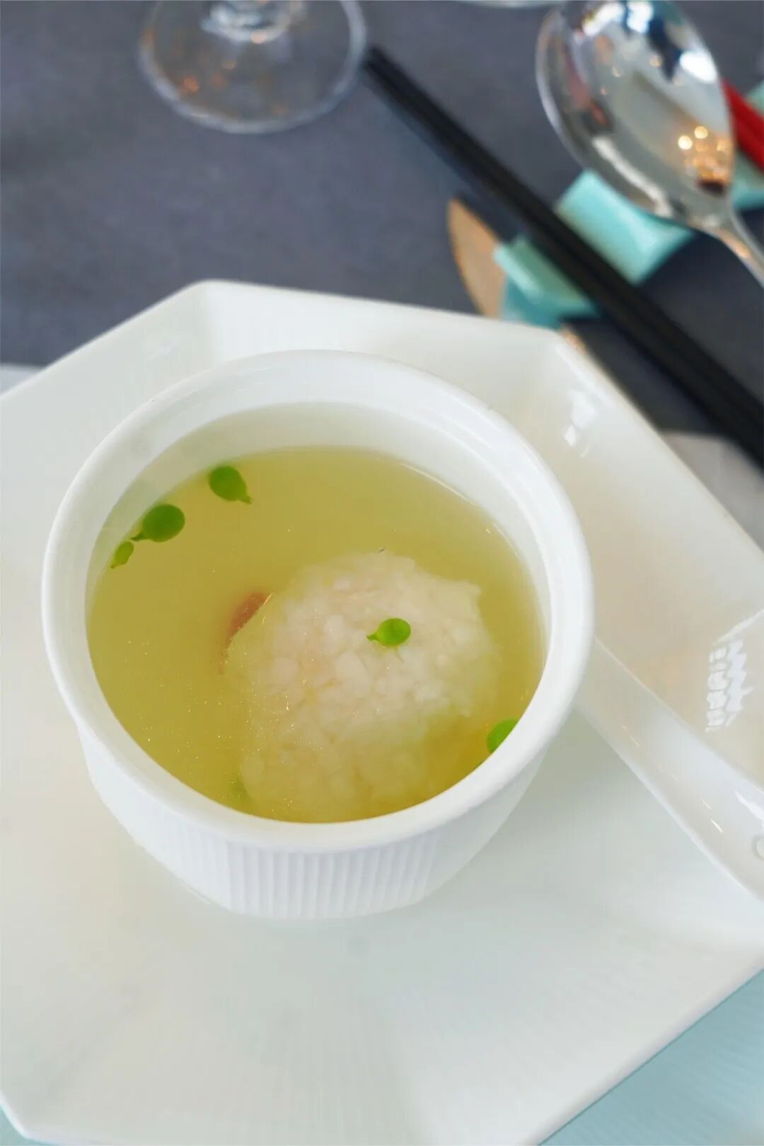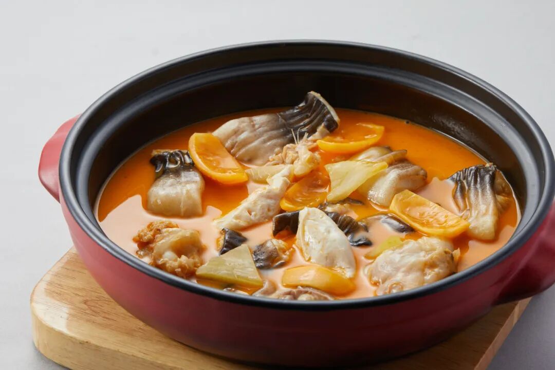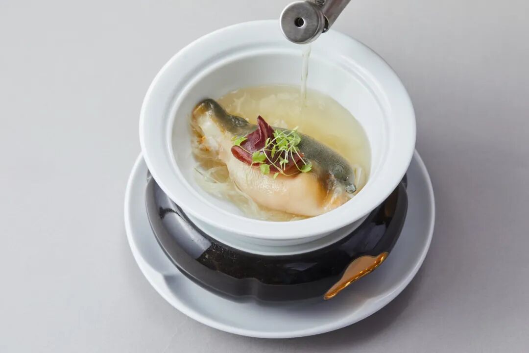 由张永亮老板首创的“豚包翅”,脱胎于被誉为“仙鹤神针”的潮汕名菜鸽吞翅。肥厚滑嫩的河豚皮向内裹起,藏起小刺的同时卷起满满的翅针,用老鸡和河豚骨一道熬制的清汤冲淋其上。入口时,口感兼具清润与软糯,在口腔中激起无与伦比的鲜美回旋。