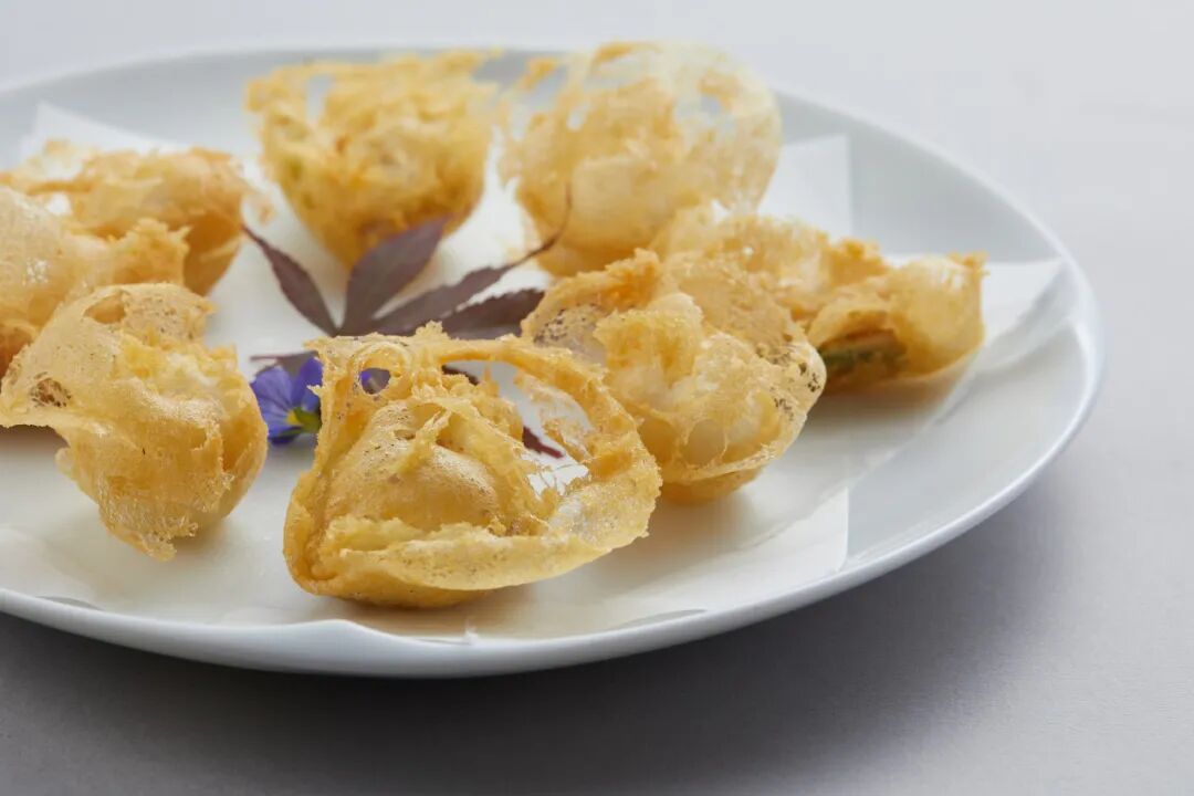 体硕膘肥、鲜嫩不腥的鮰鱼,吃法多分红白两种。在永·江臻却能吃到颇有新意的天妇罗和酸汤制法。一道“天妇罗鲜鮰肚拼百合”,在自带软边的鲜美鮰鱼肚内填塞入喷香的青椒酱,以天妇罗的做法酥炸,一口下去是酥松与黏糯、油脂与椒香的曼妙层次。另一边,兰州百合捣碎成泥后捏作丸子,同样进行酥炸,又是另一番清香扑鼻的软糯雅致。“酸汤生态鮰鱼”则是以酸爽开胃的辛香风味与鮰鱼的鲜美两相应和,带来提神醒脑的夏日味觉盛宴。